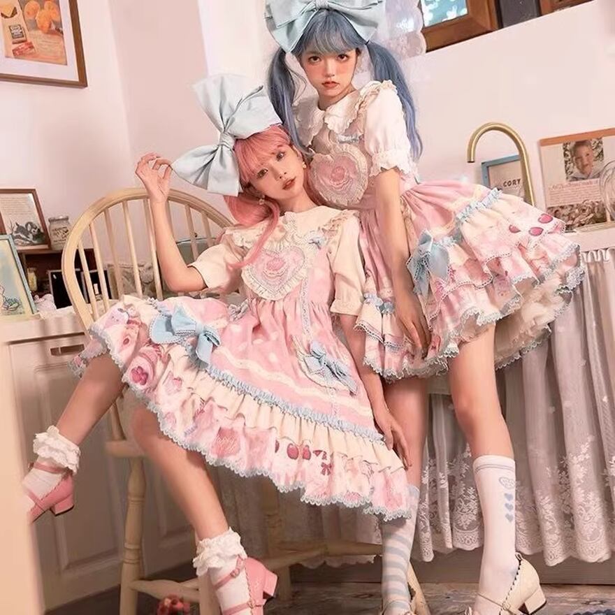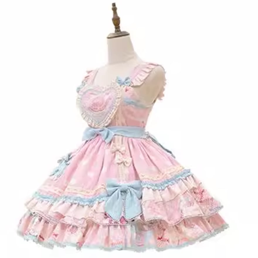 鮮やかなパステルピンクを基調に、水色のリボンやフリル、可愛らしいプリントが散りばめられたロリータジャンパースカートのセットアップです。