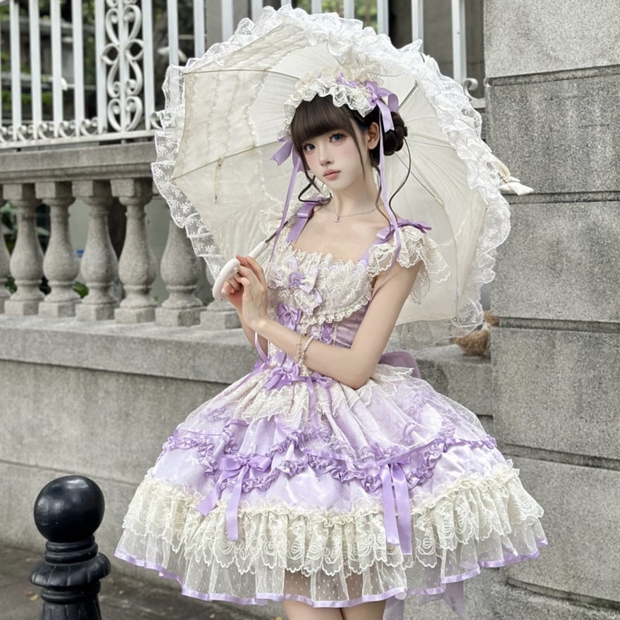 淡いパープルとミントグリーンの2色展開の、幾重にも重ねられたフリルとレースが華やかな甘ロリ系のジャンパースカートです。