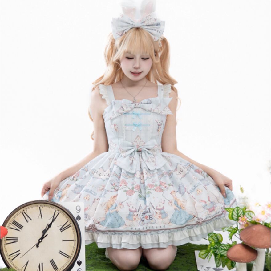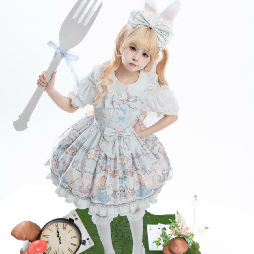 淡い水色の生地に、アリスの世界観をイメージした可愛らしいプリントが施された、ワンピースとジャンパースカートの2タイプです。
