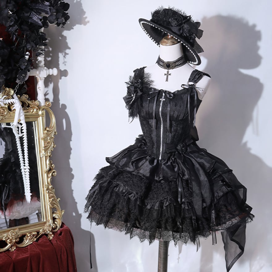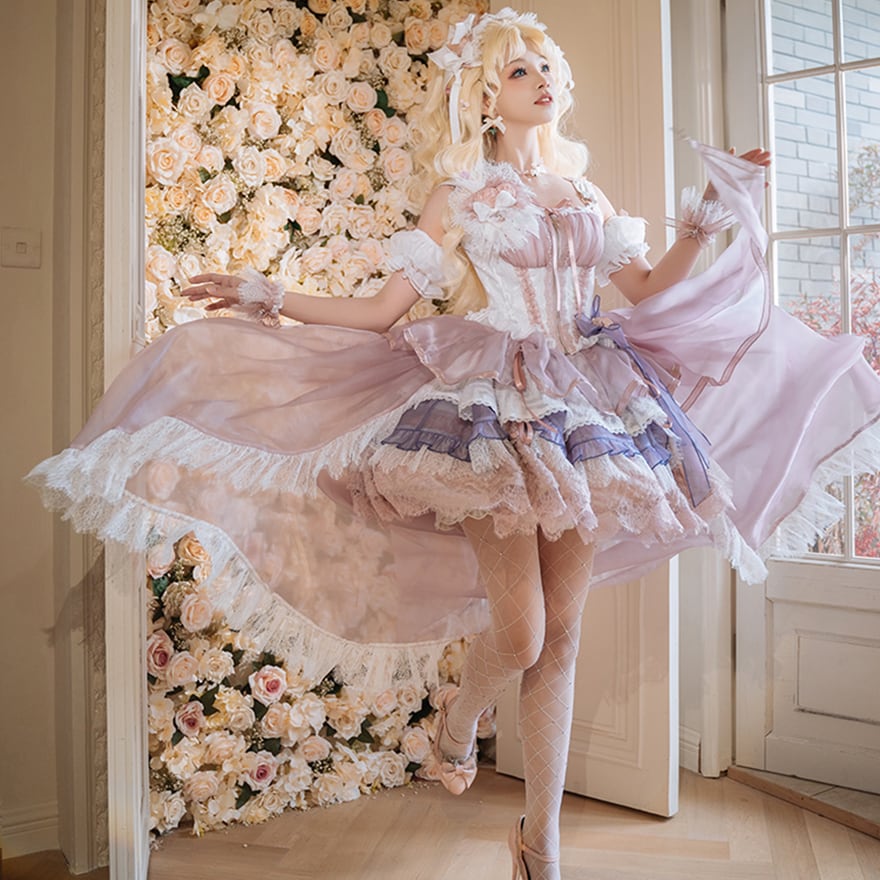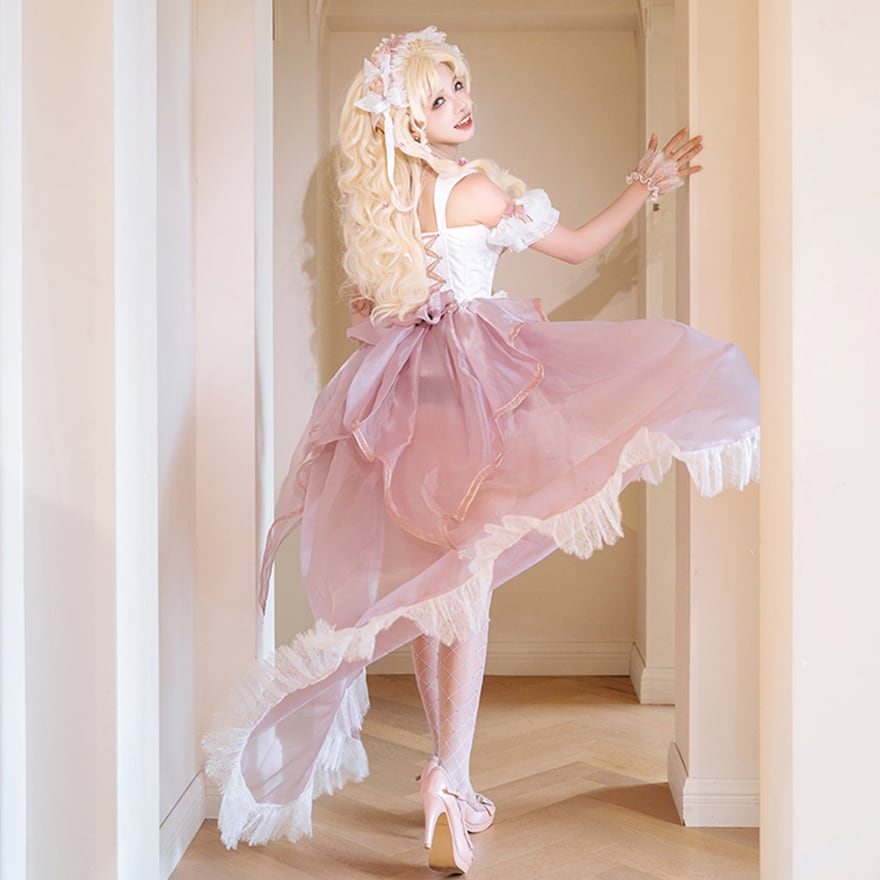白、黒、ピンクの3色展開で、繊細なレースとフリルが幾重にも重なった、華やかなロリータファッションのセットアップです。コルセット風のトップスと、アシンメトリーなヘムラインのスカートが特徴的。透け感のあるオーガンジーのトレーンが、より一層ドレッシーでゴージャスな雰囲気を演出します。