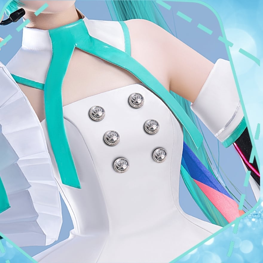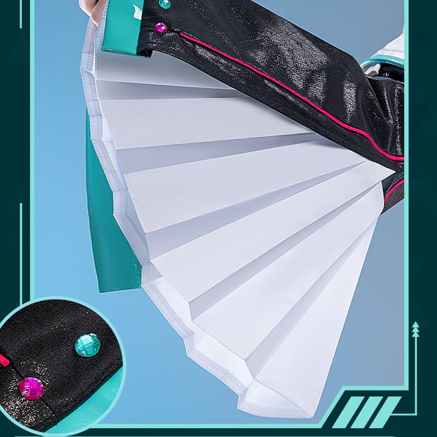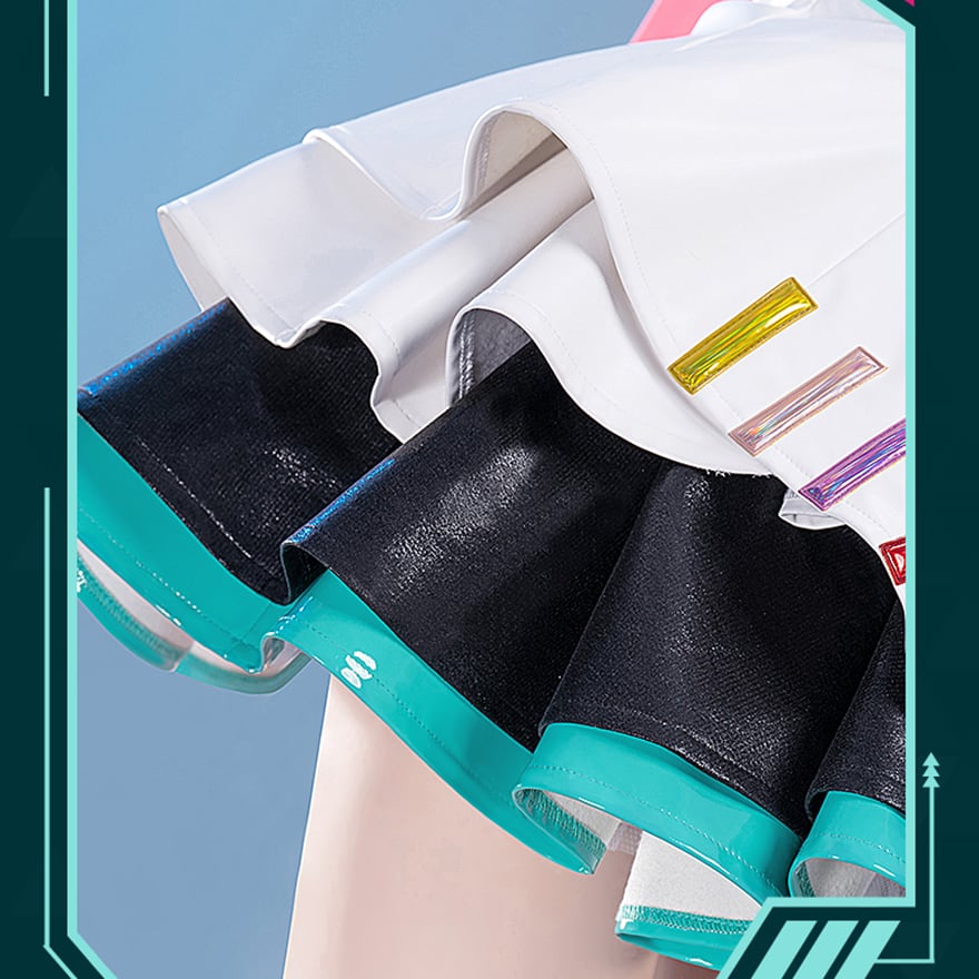 白と黒を基調とし、鮮やかなターコイズブルーの縁取りがアクセントになっています。袖口のフリルや、スカートのプリーツが可愛らしさを演出し、未来的なデザインの中にキュートな要素が散りばめられています。