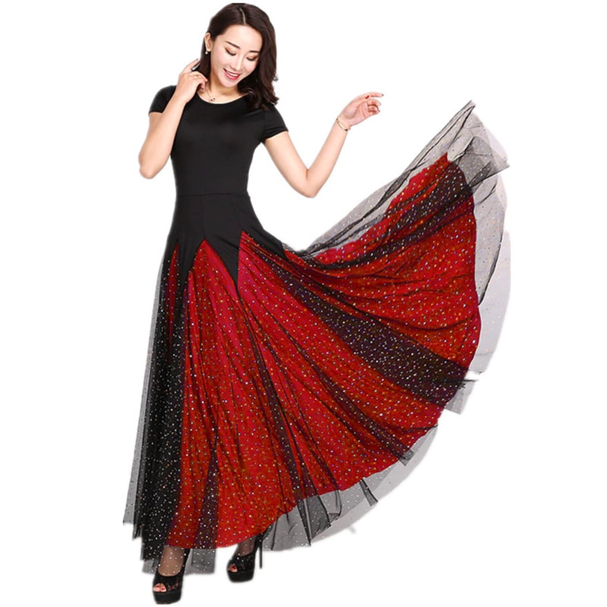 黒のシンプルなトップスと、パープルまたはレッドの華やかなロングスカートを組み合わせた社交ダンス用のワンピースです。