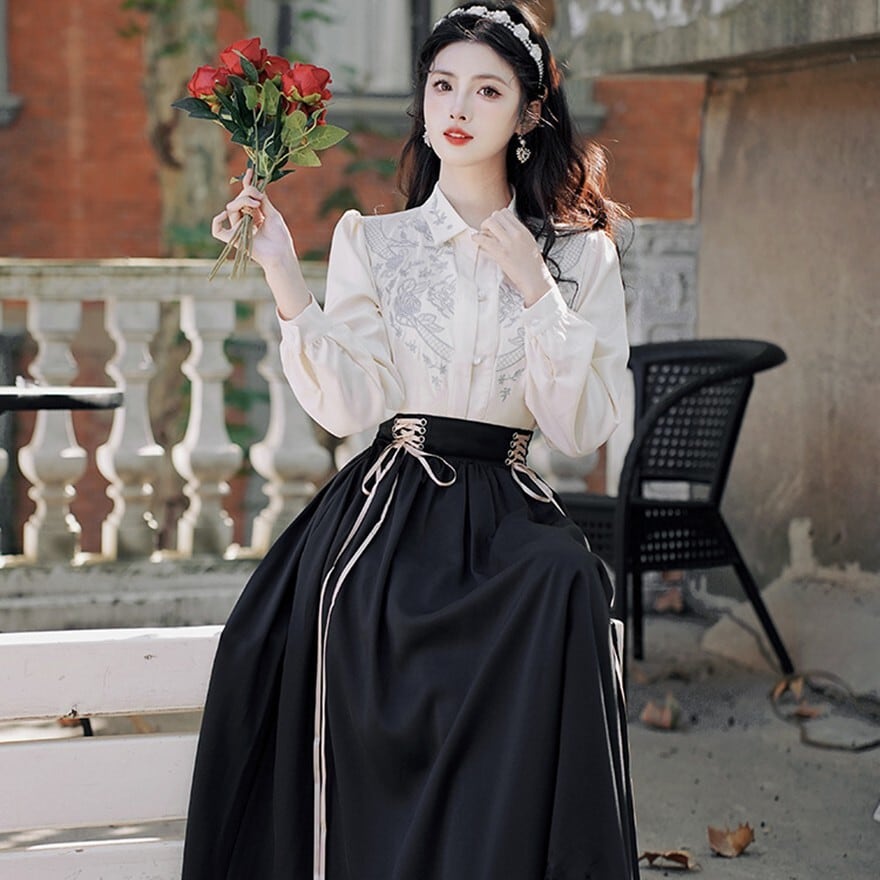 ブラウスはホワイトの生地に、襟元や胸元に繊細な刺繍が施されており、清楚で上品な印象を与えます。