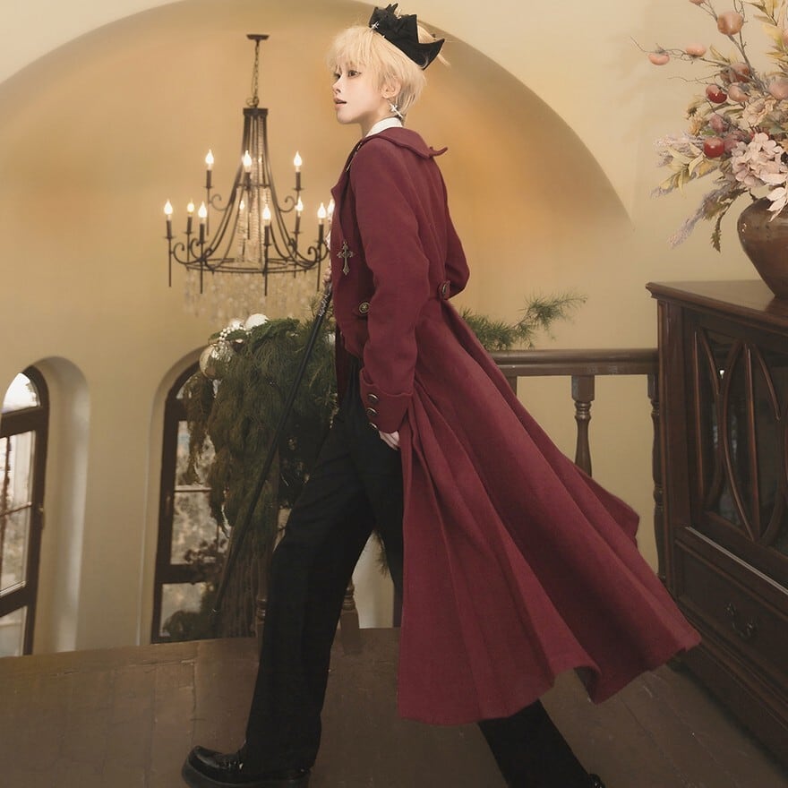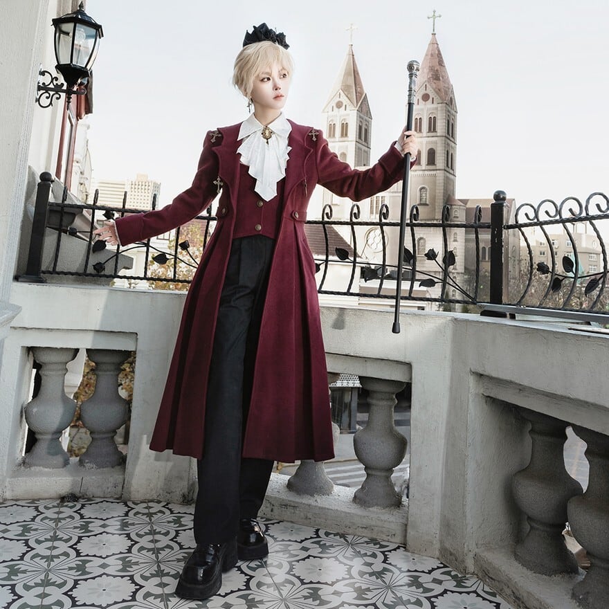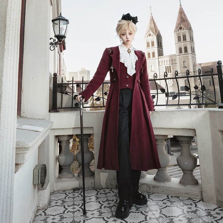 深いワインレッドの生地に、ゴールドのクロスモチーフが施された、皇子系ロリータのセットアップです。