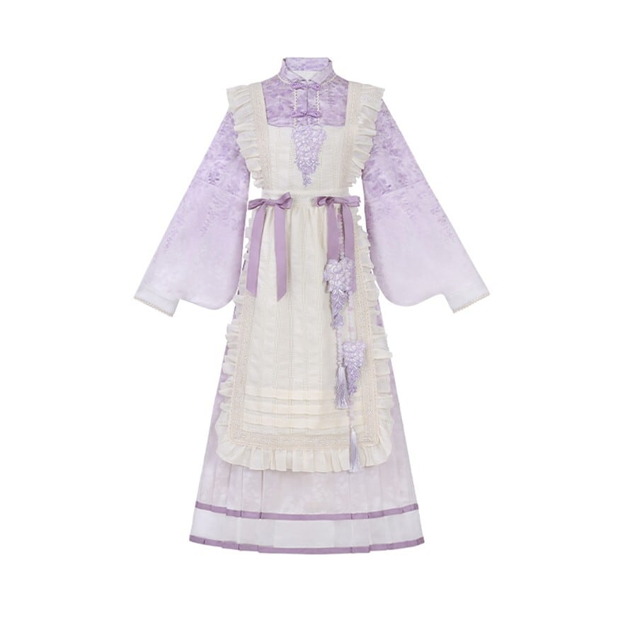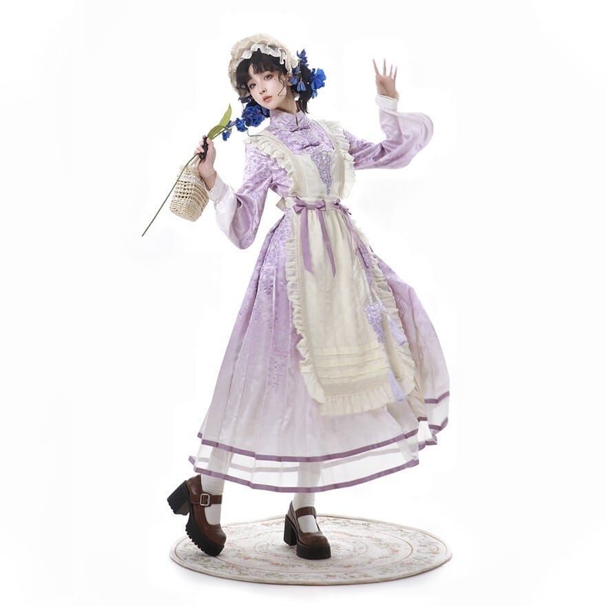 淡いラベンダーカラーの生地に、藤の花の模様が織り込まれた、和風ロリータのメイドワンピースです。