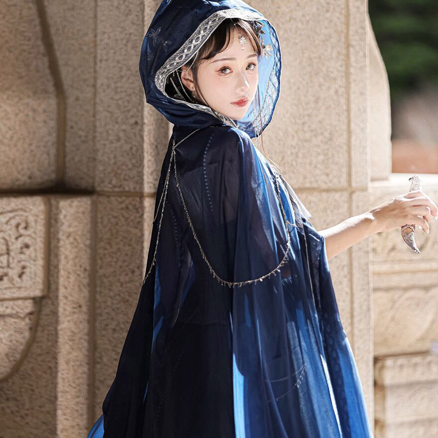深く美しい色合いの生地が優雅に揺れる、フード付きの中華風マントです。
