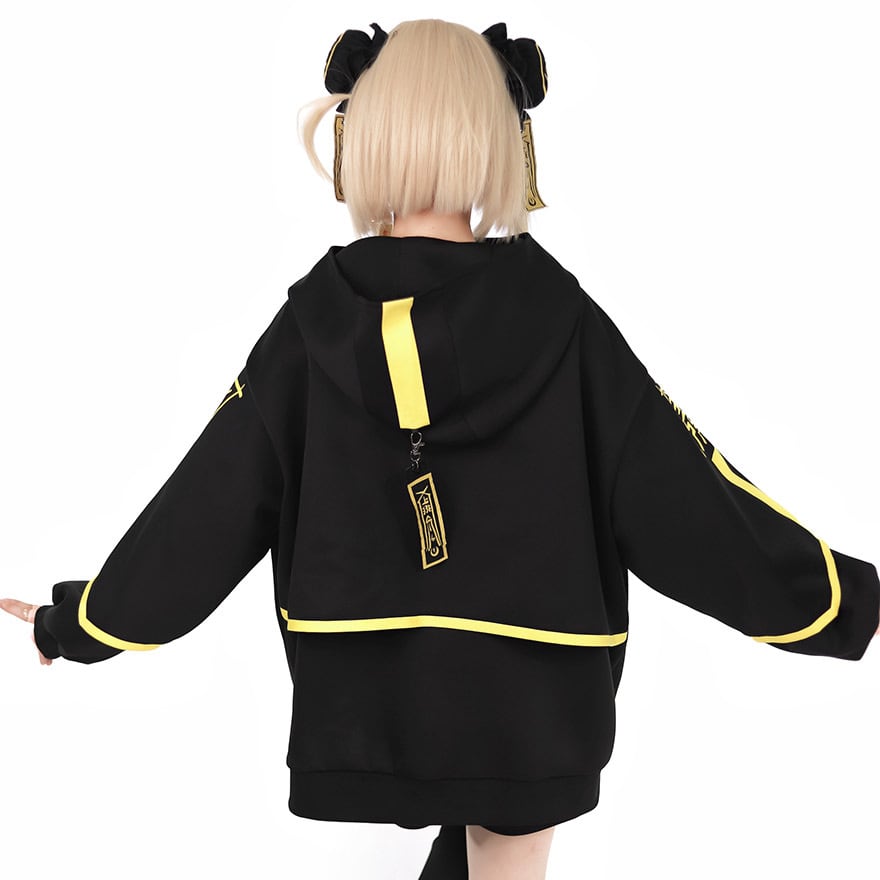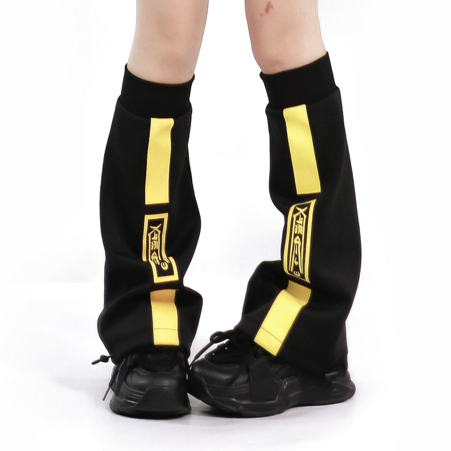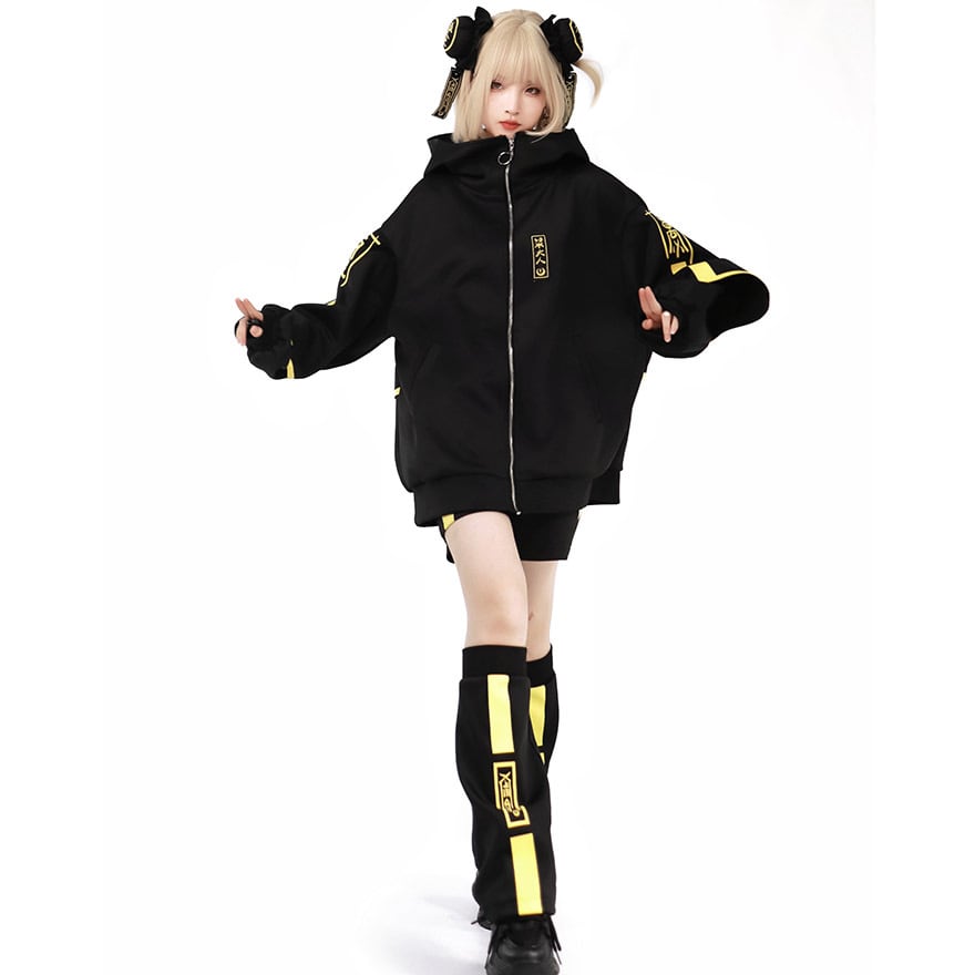 ブラックを基調とした生地に、鮮やかなイエローのラインと漢字のモチーフが映えるサイバーなデザイン。
