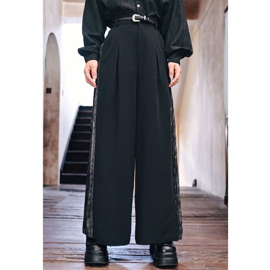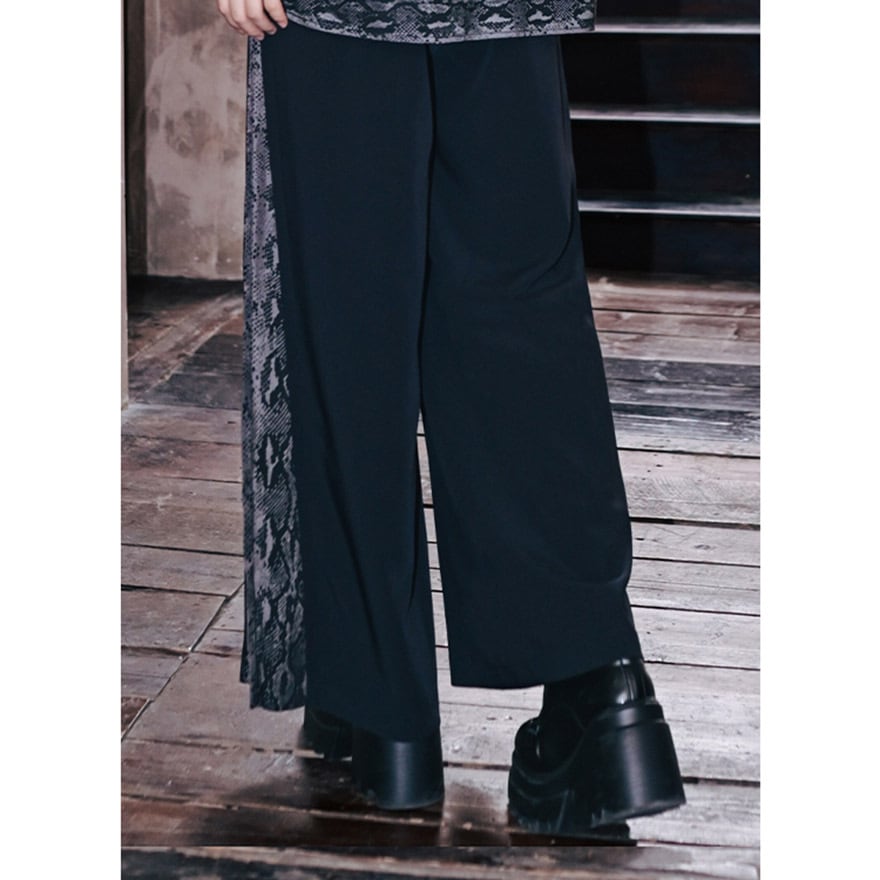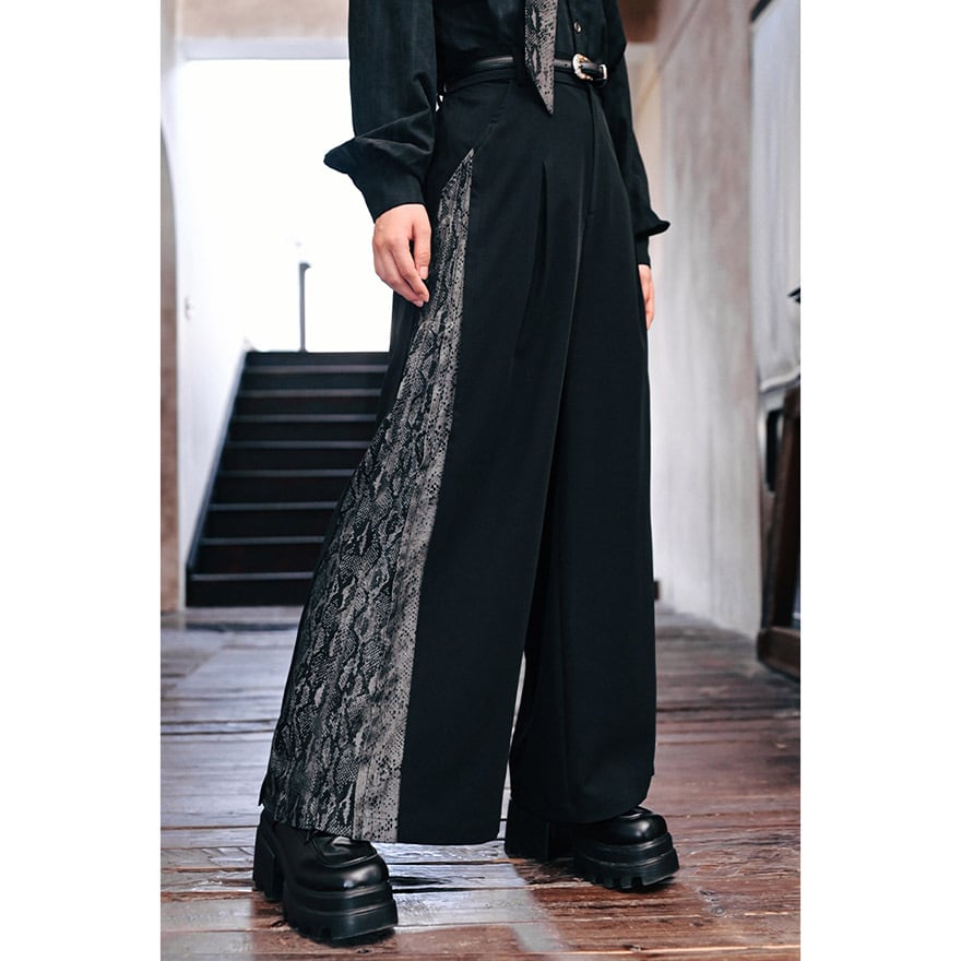 しなやかなブラックの生地に、リアルなパイソン柄(蛇柄)の生地をサイドに大胆に切り替えた、デザイン性の高いワイドパンツです。