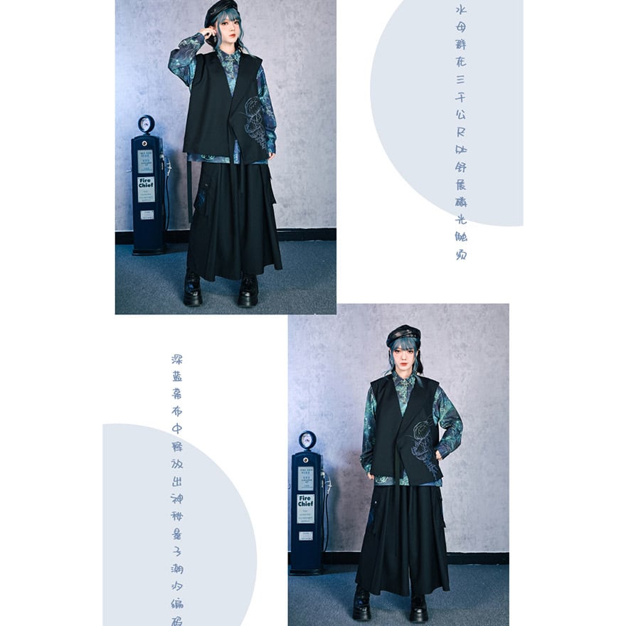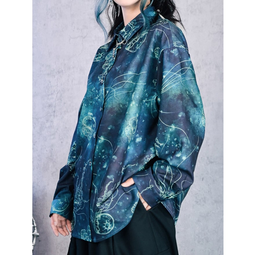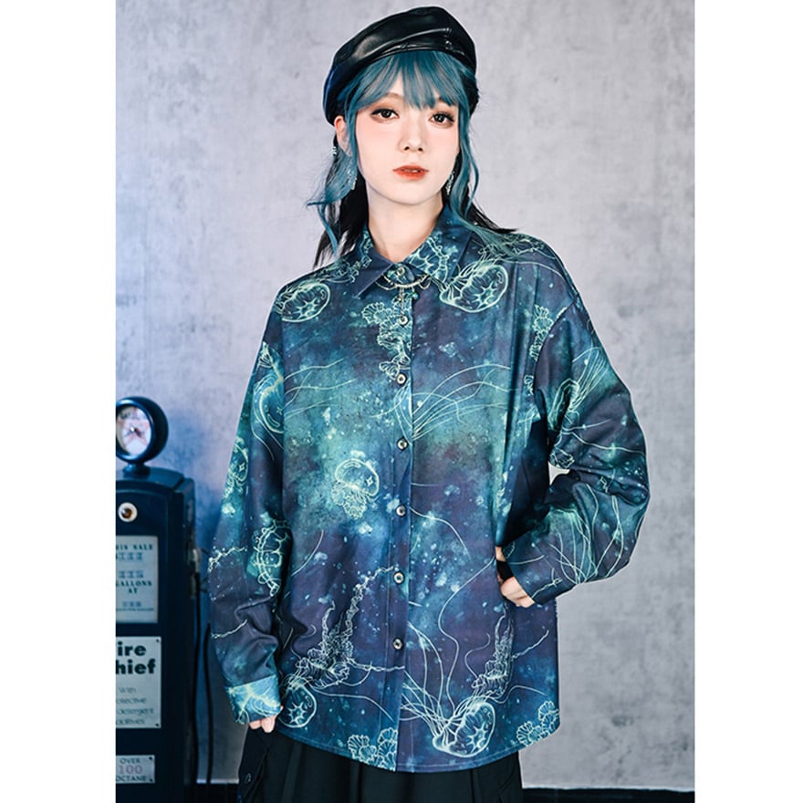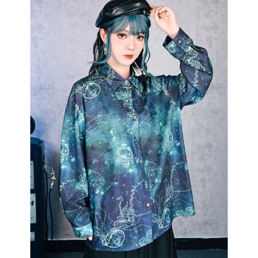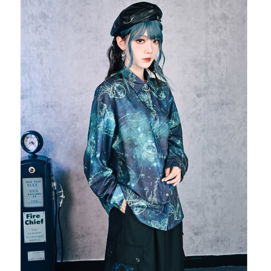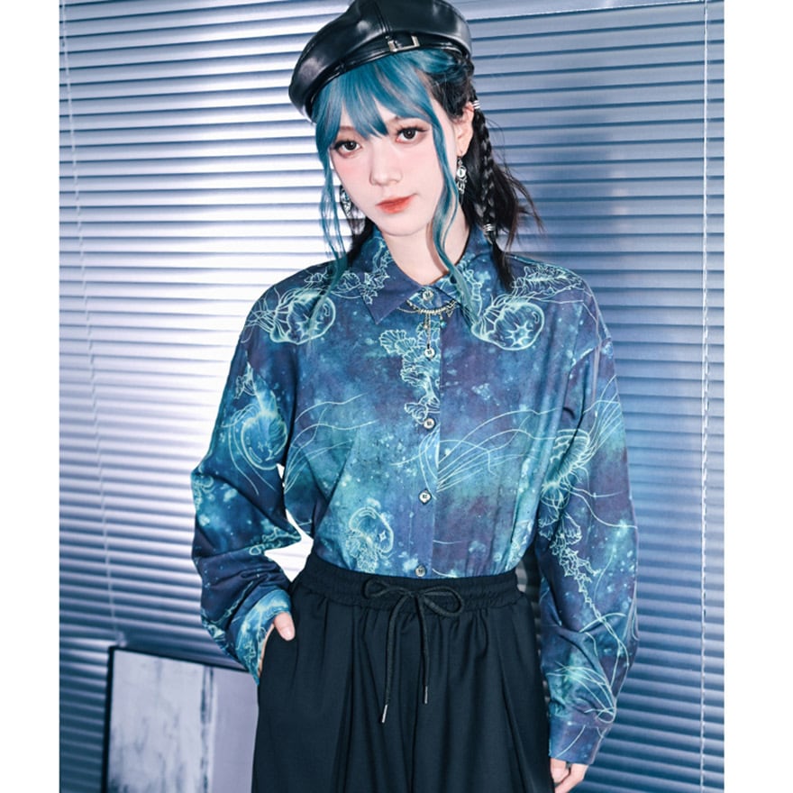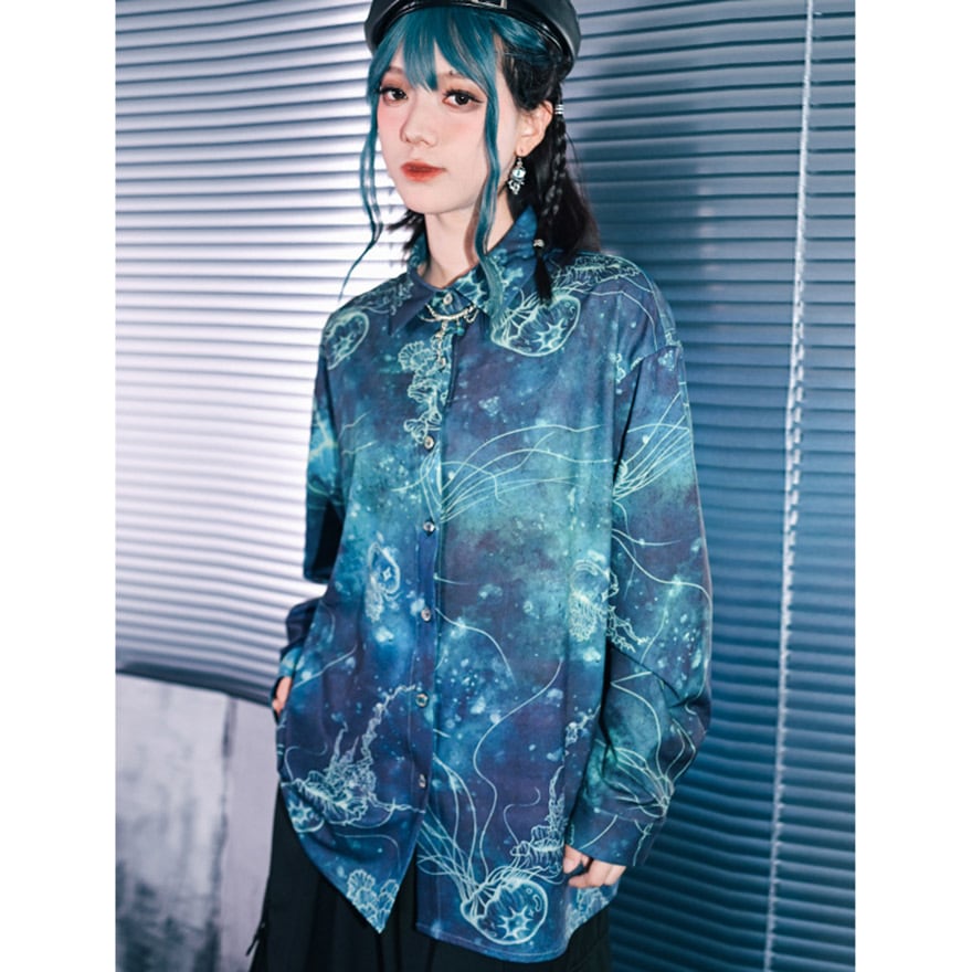 関連キーワード: #デザインシャツ #モード系 #ストリートファッション #サブカル #プリントシャツ #クラゲ #海月 #宇宙柄 #ギャラクシー #幻想的 #個性的 #ユニセックス #オーバーサイズ #アート #青文字系