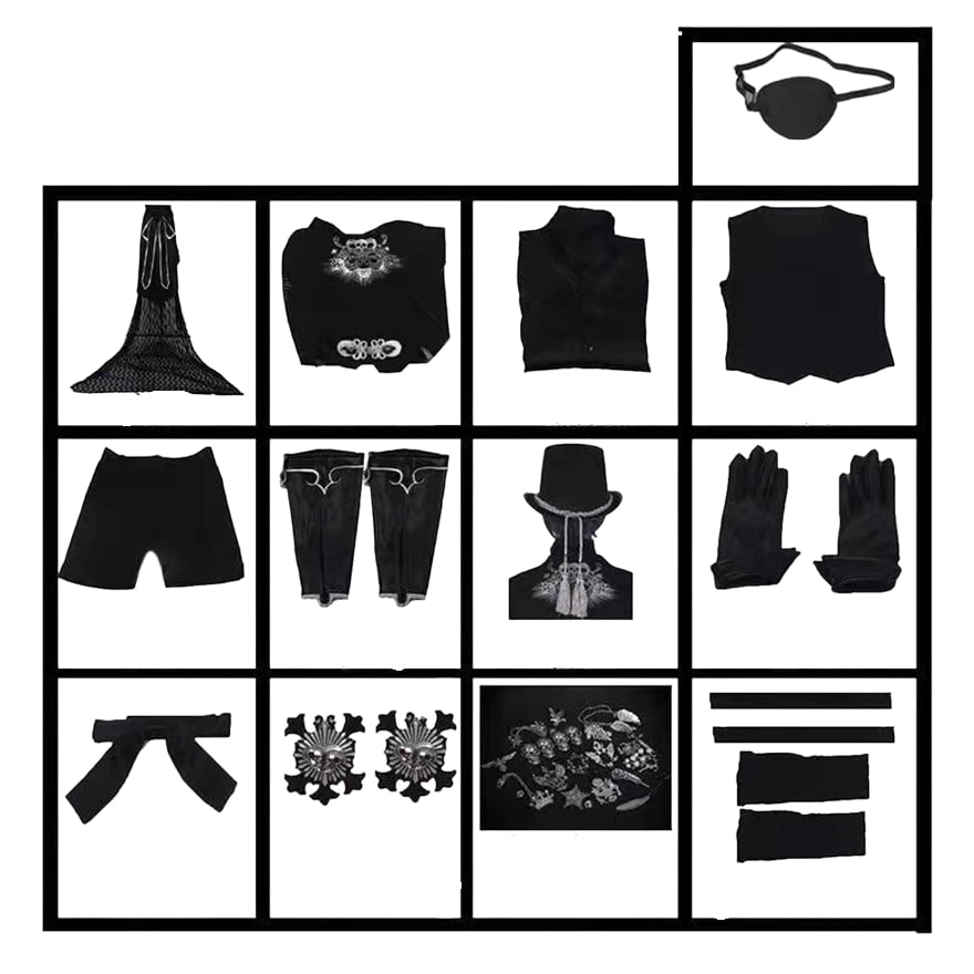 セットアップ :アイパッチ、ケープ 、 ジャケット、黒いシャツ、ベスト、ショートパンツ、レッグカバー、 帽子、レザーグローブ、 蝶ネクタイ、レッグベルト+ニーハイソックス、15個のカスタムメタルパーツ、レッグアクセサリー+スカルチャーム4個