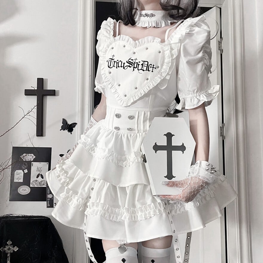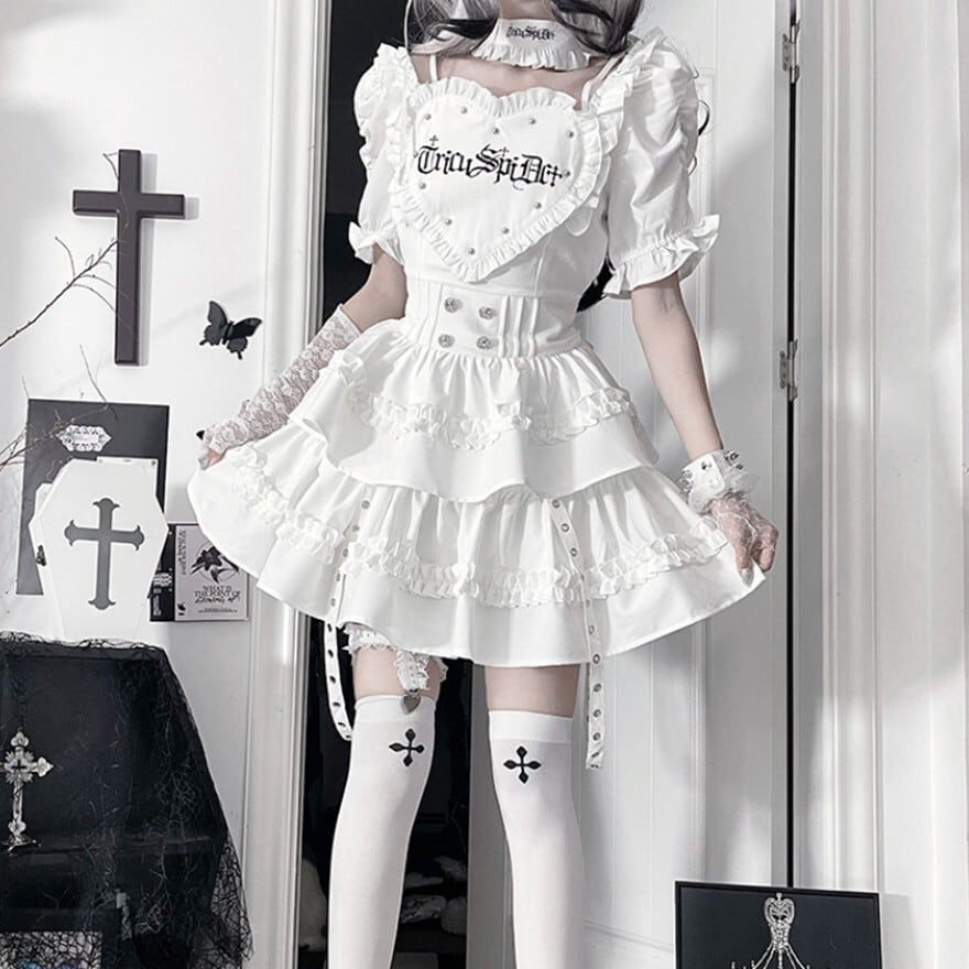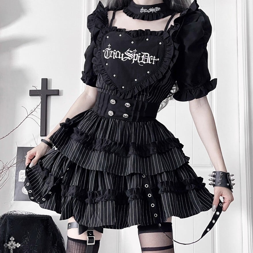 ハート形の胸当てとティアードスカートが特徴的な、ゴシックロリータワンピースです。