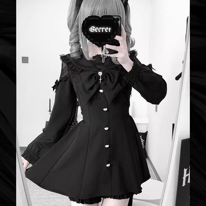 レースとフリルで縁取られた大きな襟が顔周りを華やかに演出し、胸元の大きなリボンと十字架のチャームがダークな世界観を引き立てます。