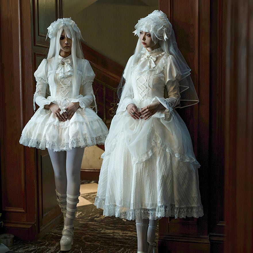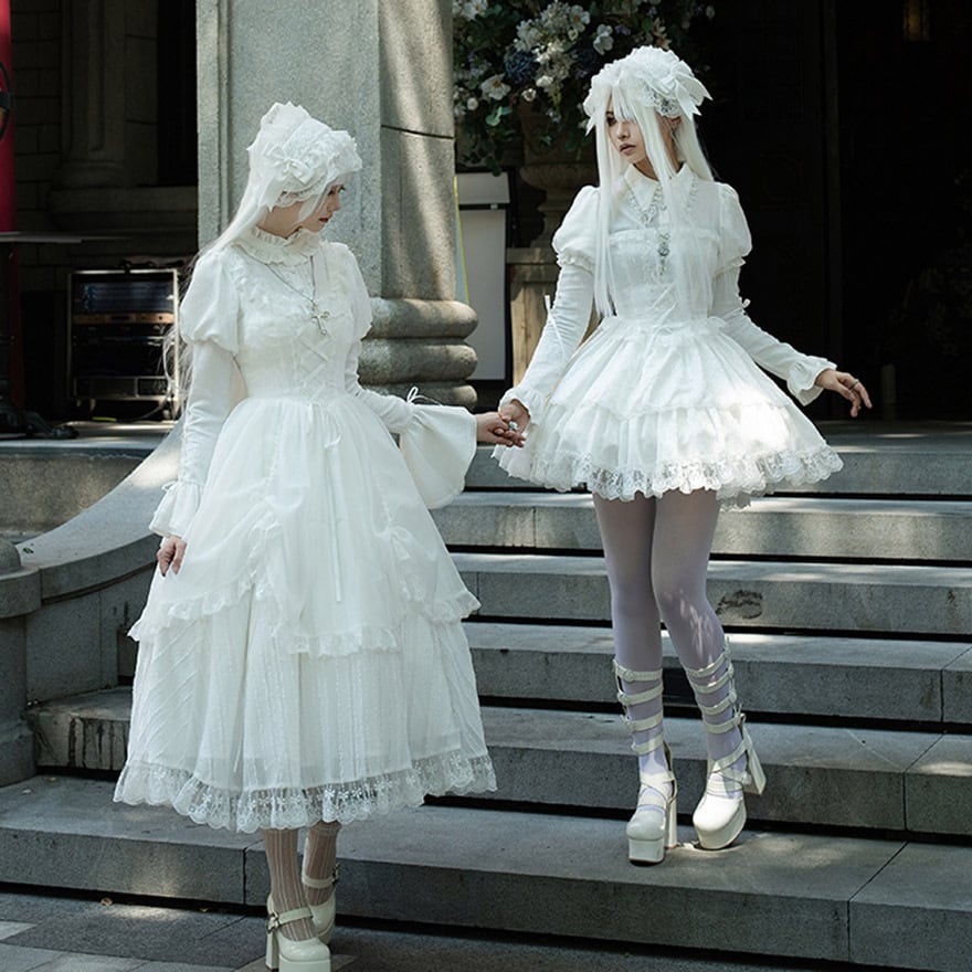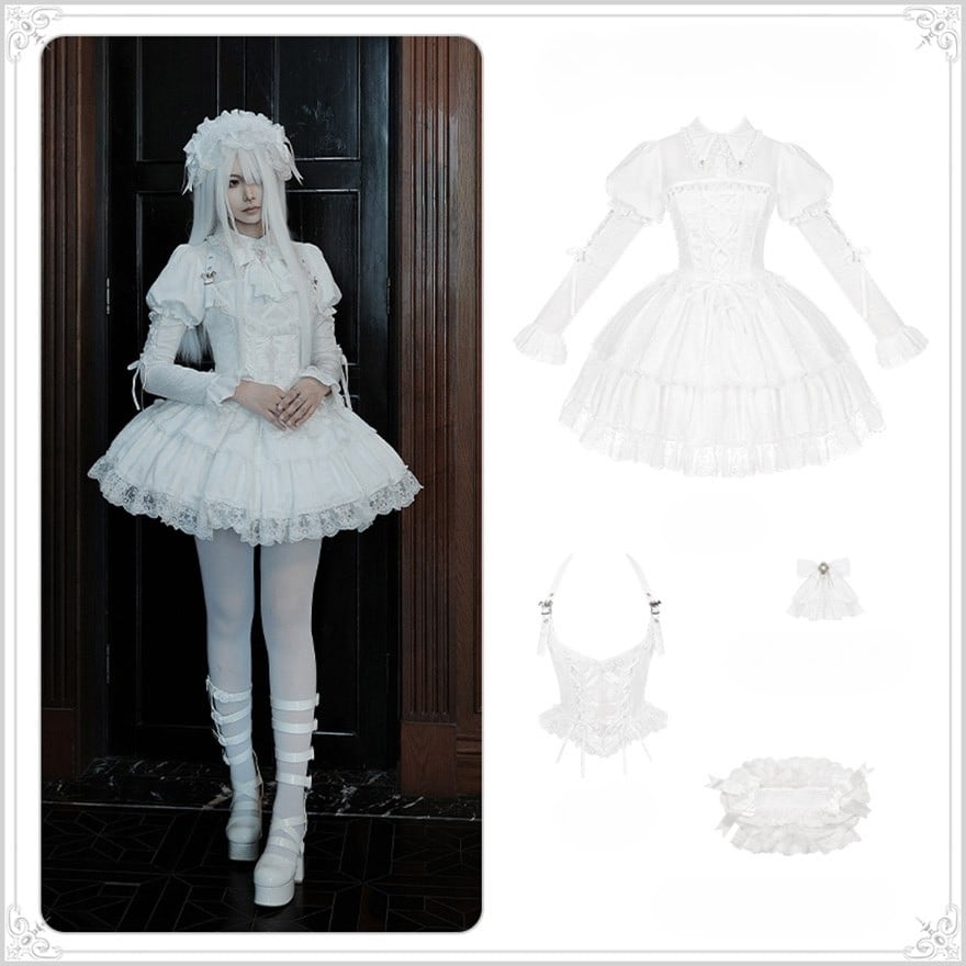 全身を穢れのない純白で統一した、クラシカルで可憐なミニ丈ワンピースセットです。