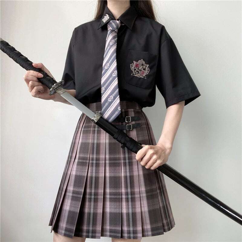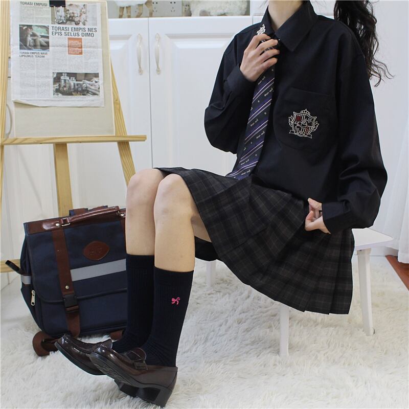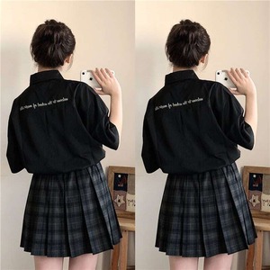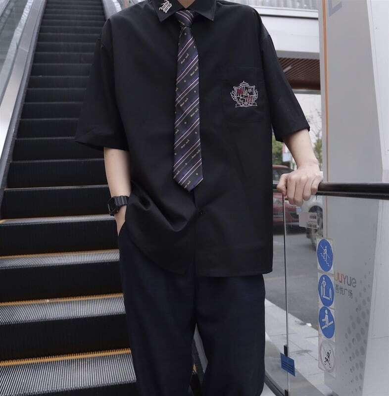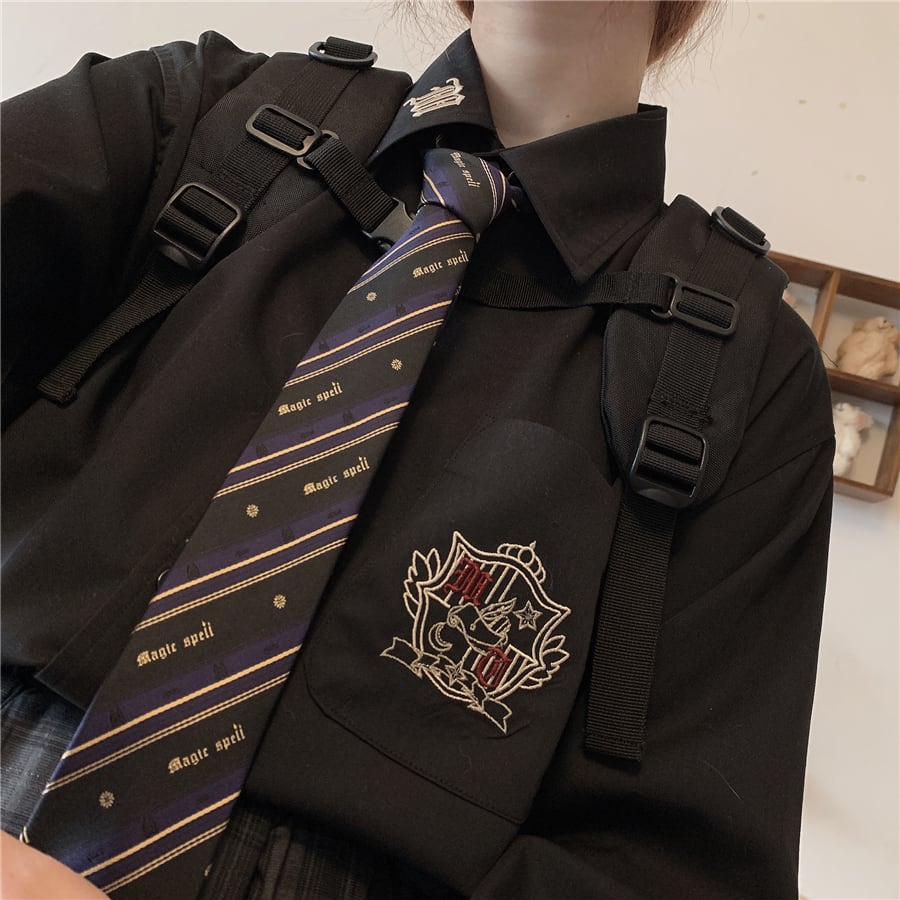 ユニセックスで着用頂ける黒シャツと白シャツ。英字のバックロゴに胸ポケットは学園風紋章の刺繍が病み可愛いシャツです。ネクタイ、蝶ネクタイは参考商品となります。