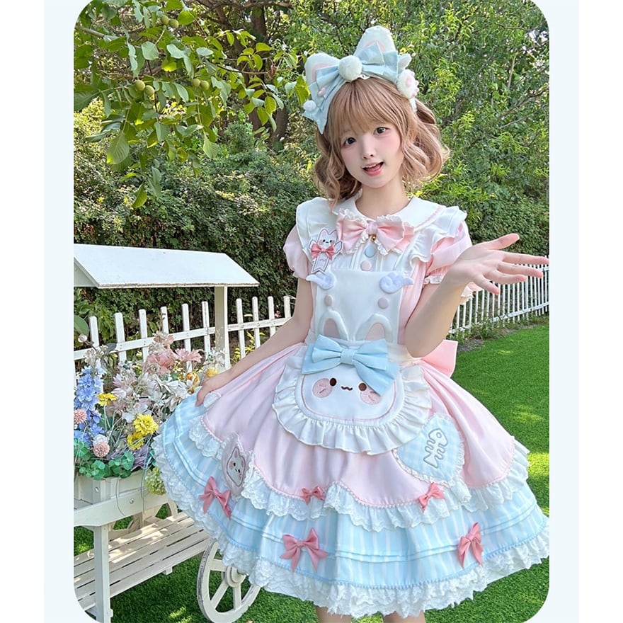 うさぎのお顔がデザインされたエプロンや、胸元・スカートにあしらわれたうさぎのワッペンが愛らしいアクセントに。