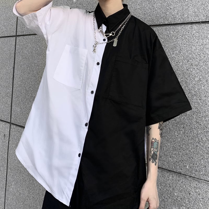 即納 Lサイズ 半袖 シャツ バイカラー コットン モノトーン ストリート系