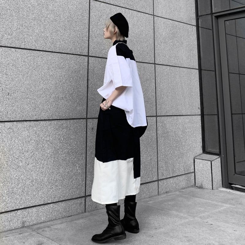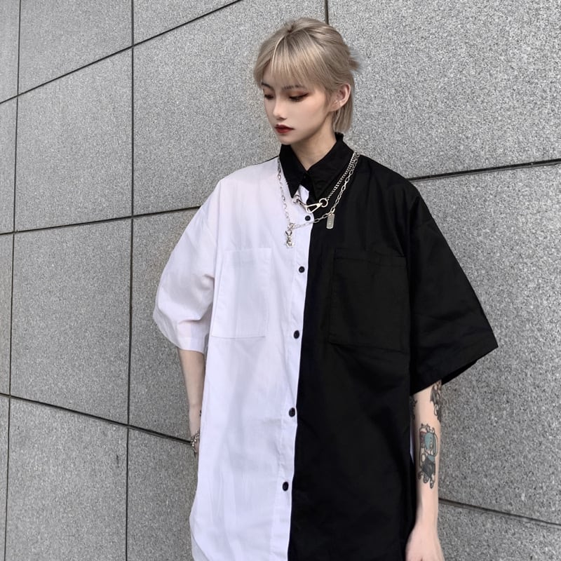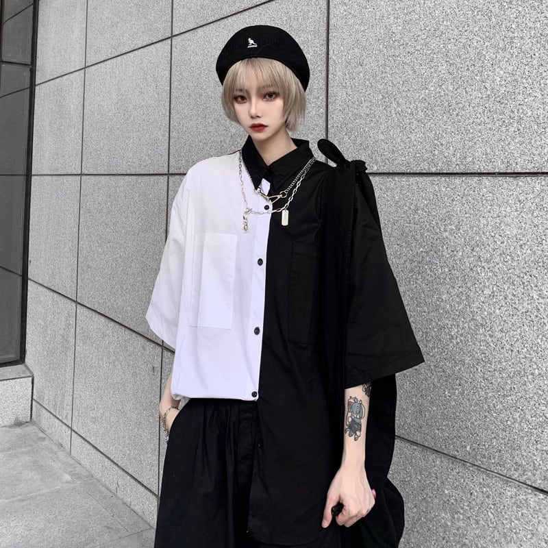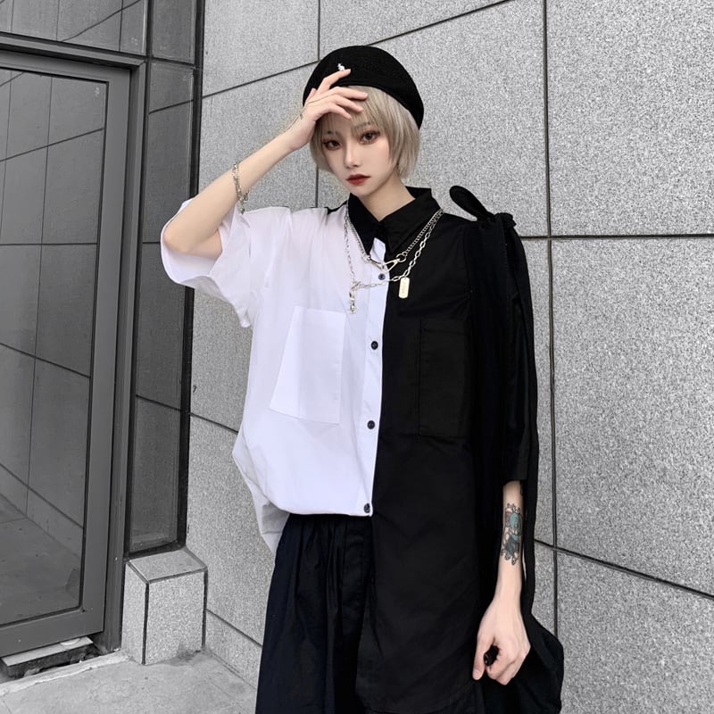 病み可愛いモノトーンのバイカラー、半袖コットンシャツです。