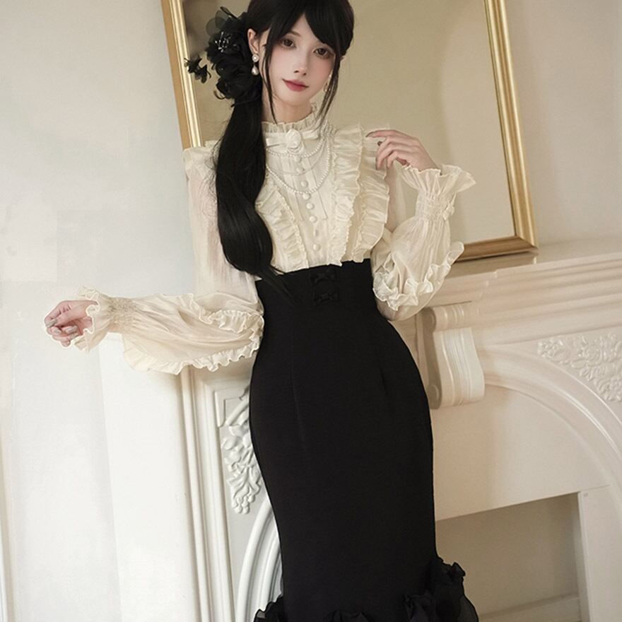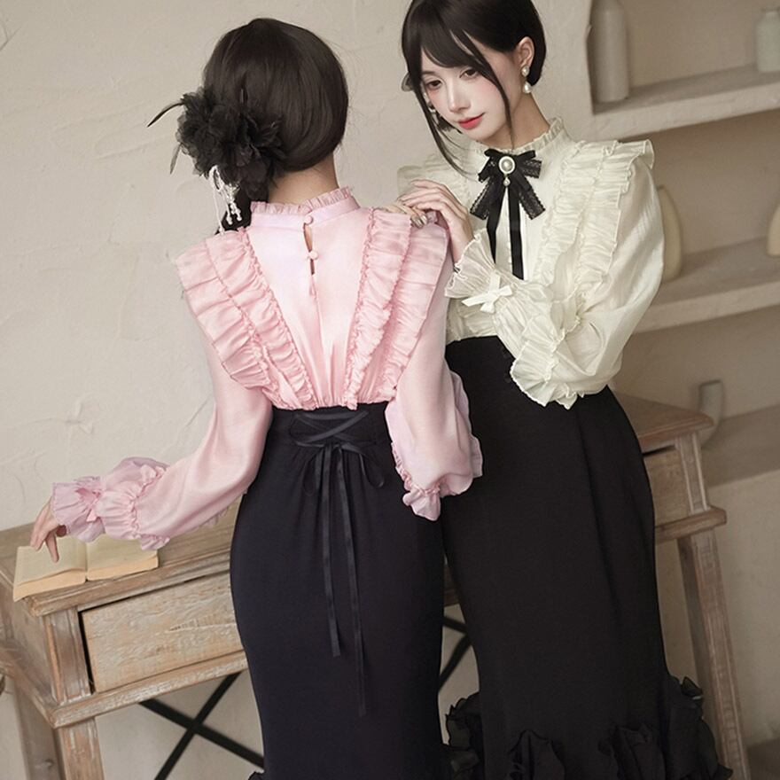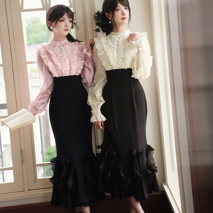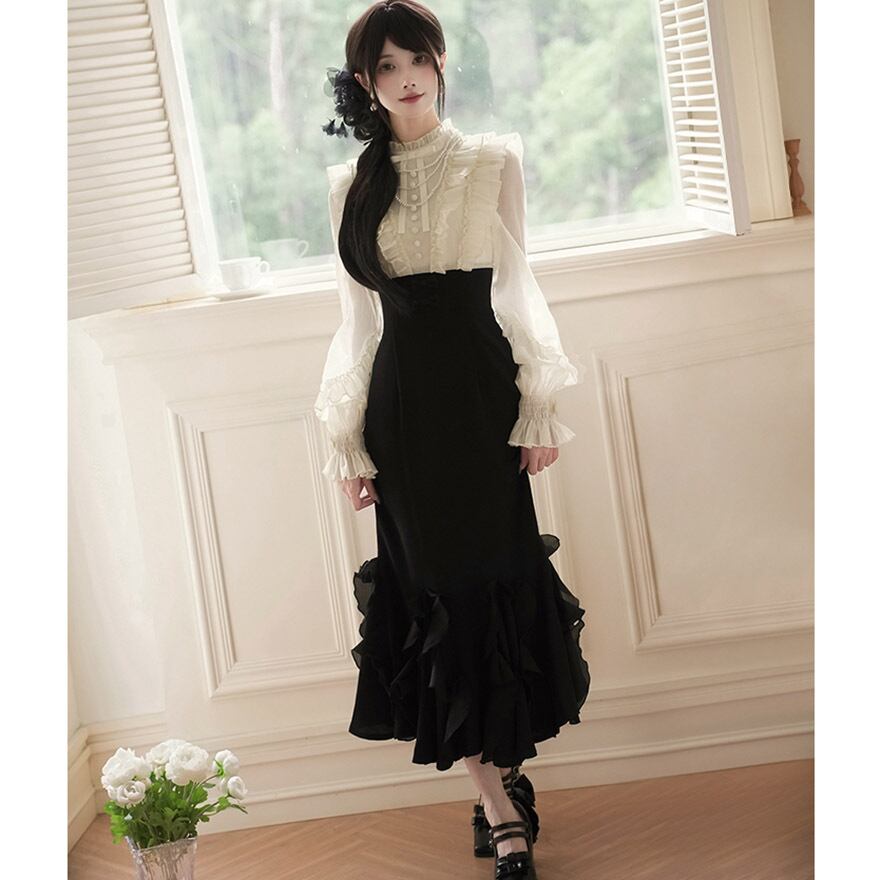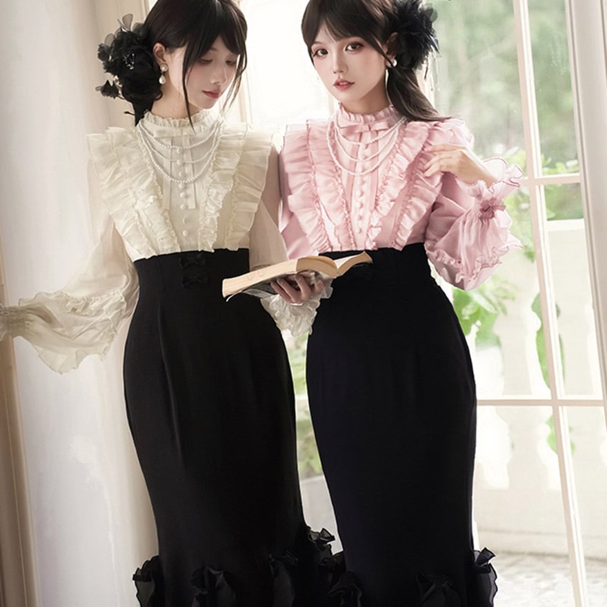 フリルたっぷりのブラウスと、ドラマティックなマーメイドスカートをドッキングした、一枚でコーディネートが完成するフェイクツーピースのロングワンピースです。
