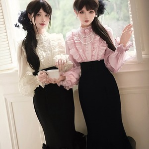 スタンドカラーの首元や胸元、袖口にあしらわれたフリルが、ヴィクトリアン朝を思わせるクラシカルで華やかな印象を与えます。