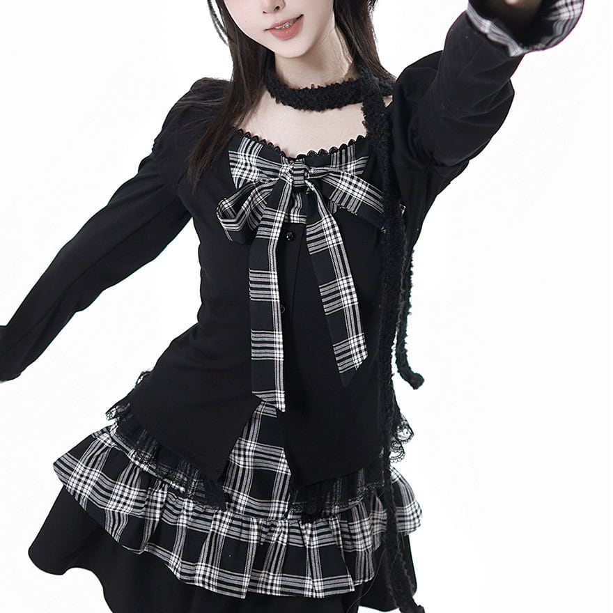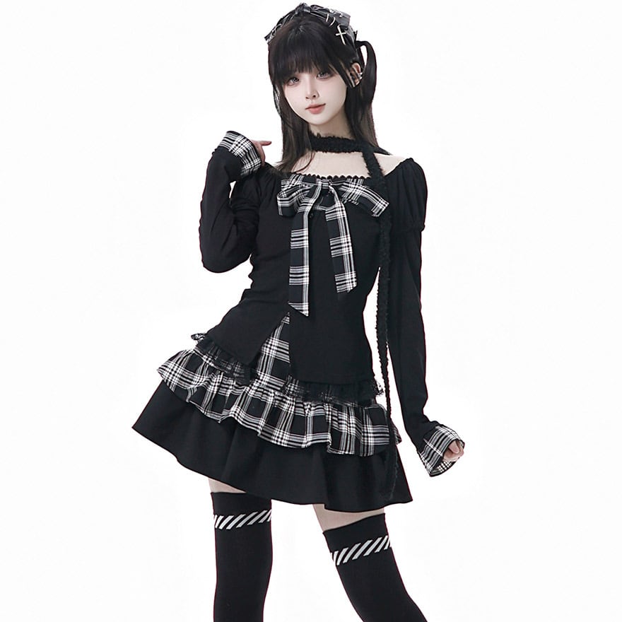 ブラックのカットソー生地に、モノトーンのチェック柄リボンが目を惹く地雷系トップスです。