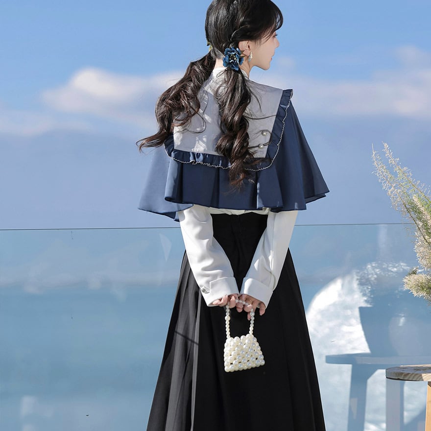チャイナボタンがアクセントのトップス、水墨画のような刺繍が施されたロングスカート、そしてケープ風ショールの豪華な3点セットです。