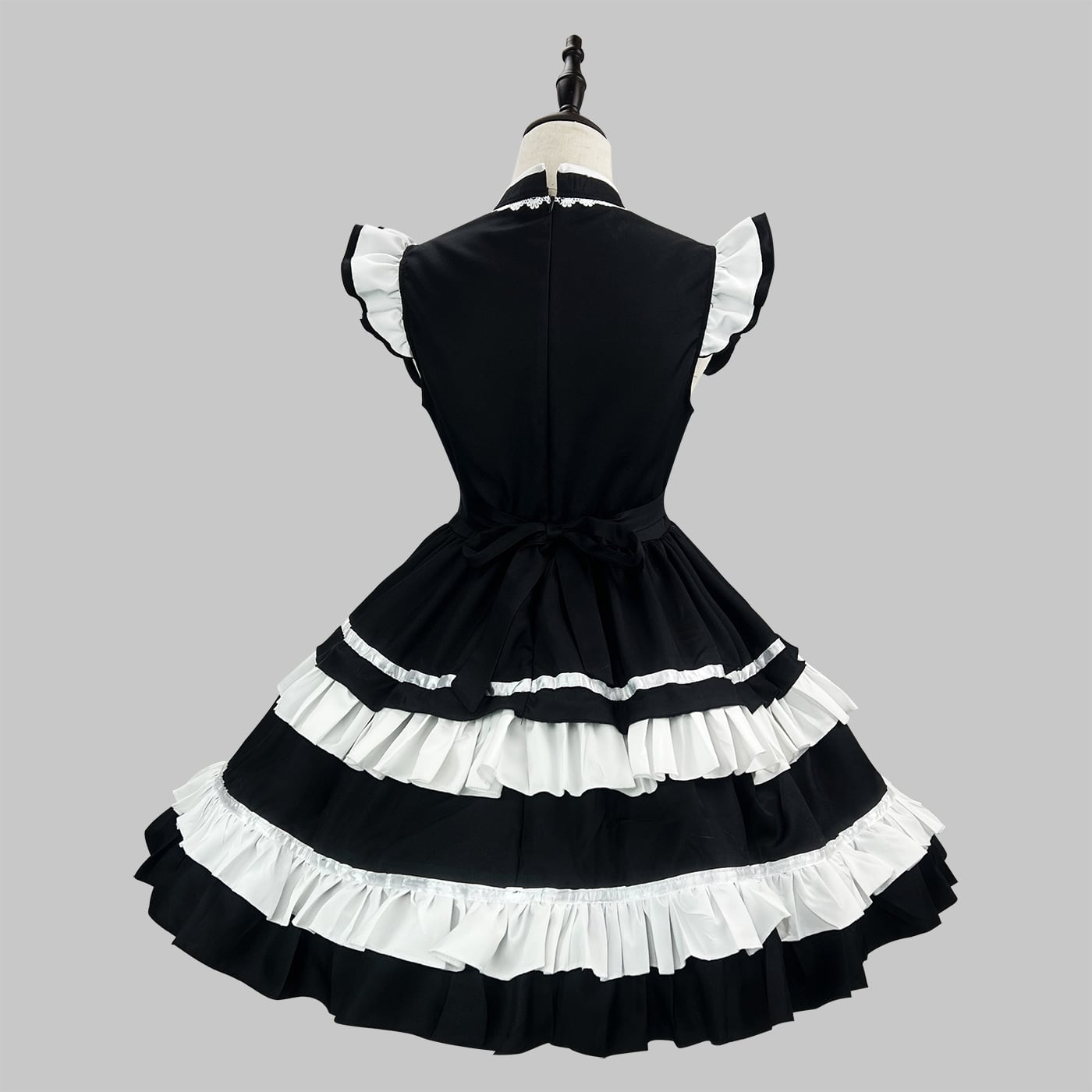 クラシカルなメイド風ロリィタワンピースです。チャイナ風の襟元と、胸元のキーホールデザインが、さりげない個性を演出。ふんわりと広がるティアードスカートは、動くたびに優雅なシルエットを描き出します。胸元の大きなリボンや、繊細なレース使い、裾にあしらわれたタッセルなど、細部にまでこだわったデザインが魅力です。