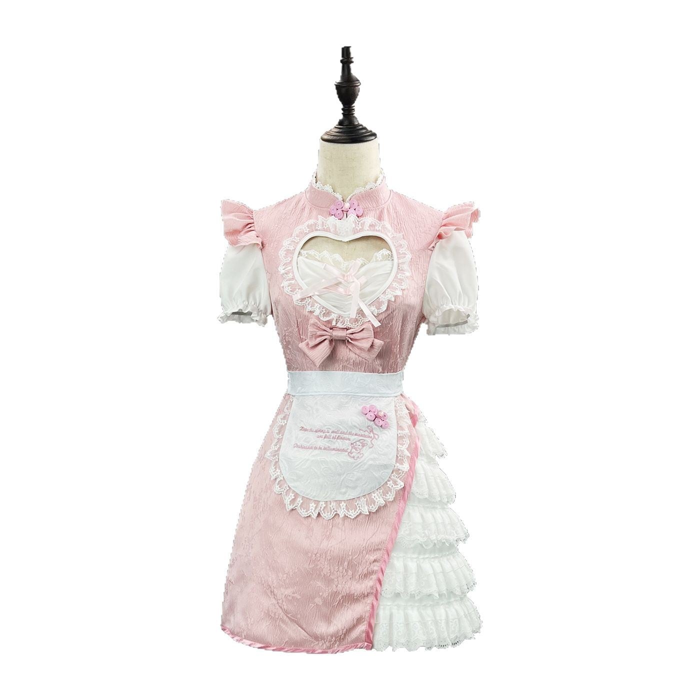 チャイナ風の襟元と、ふんわりとしたシルエットが絶妙にミックスされた、オリエンタルな魅力あふれるメイド風ロリィタワンピースです。