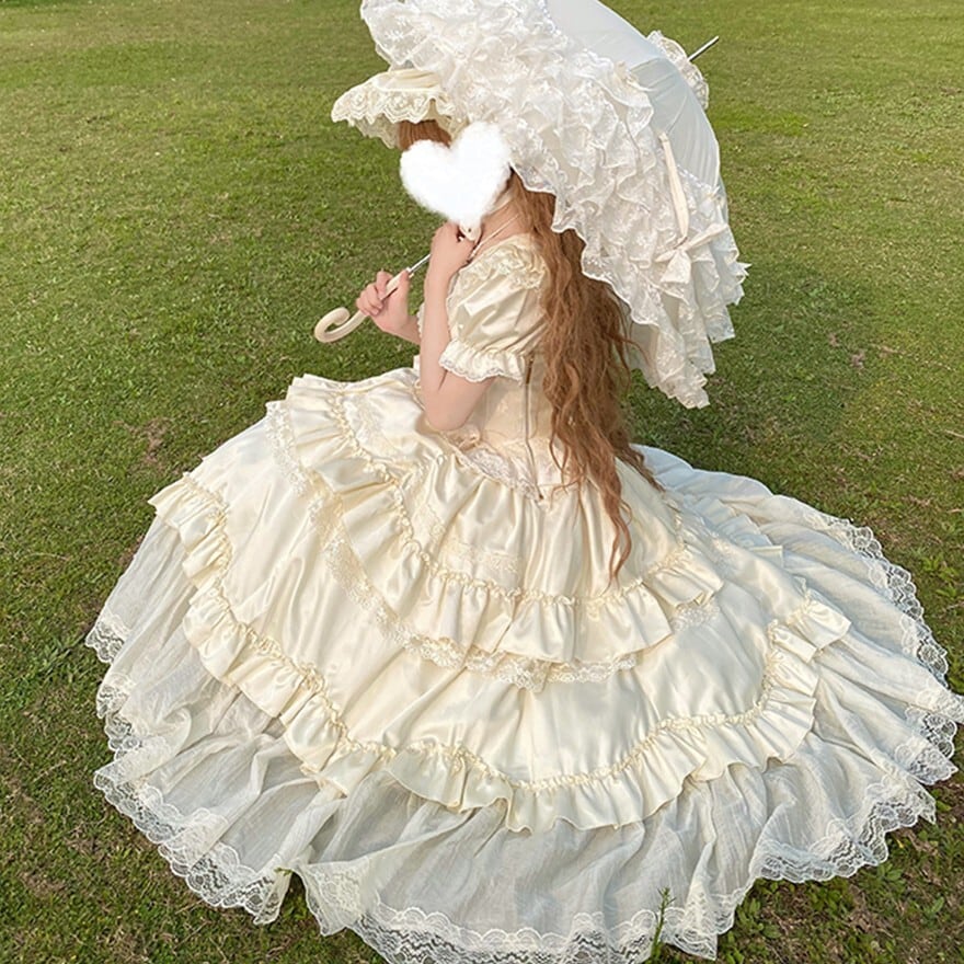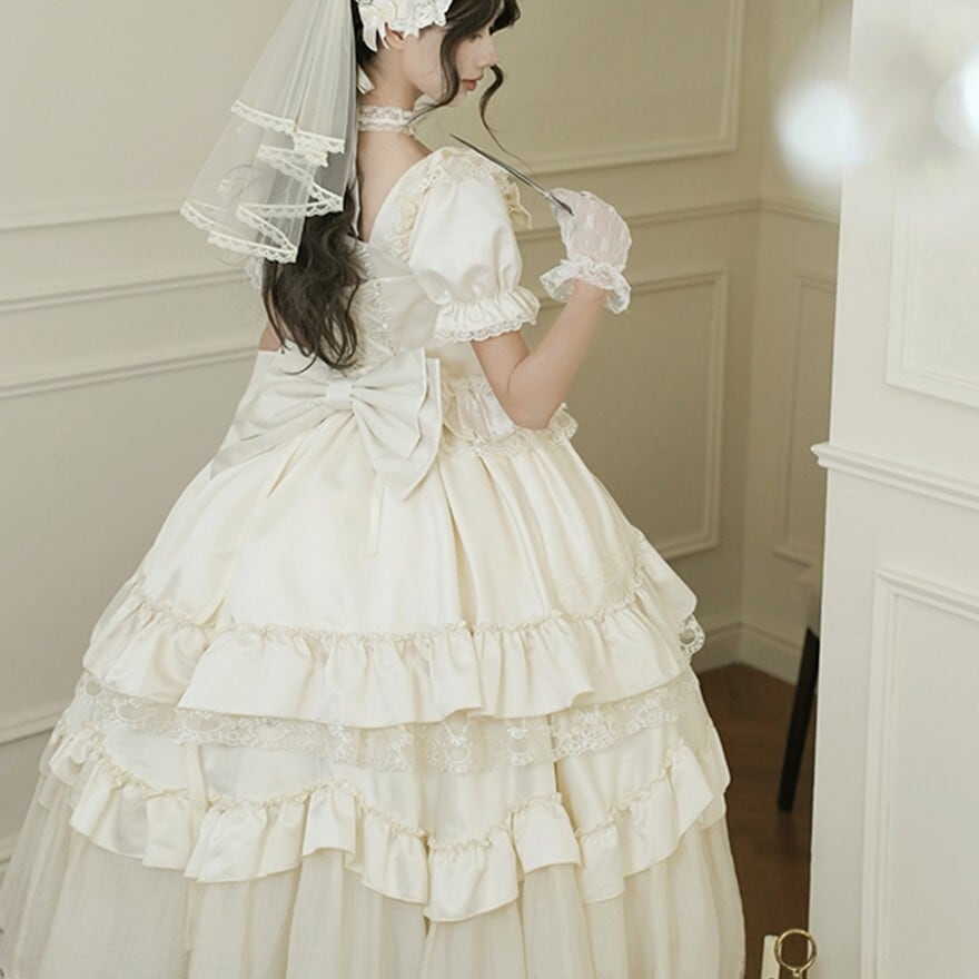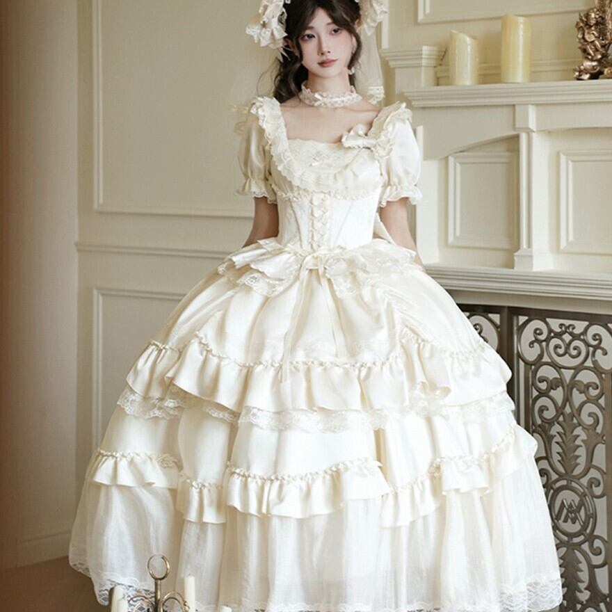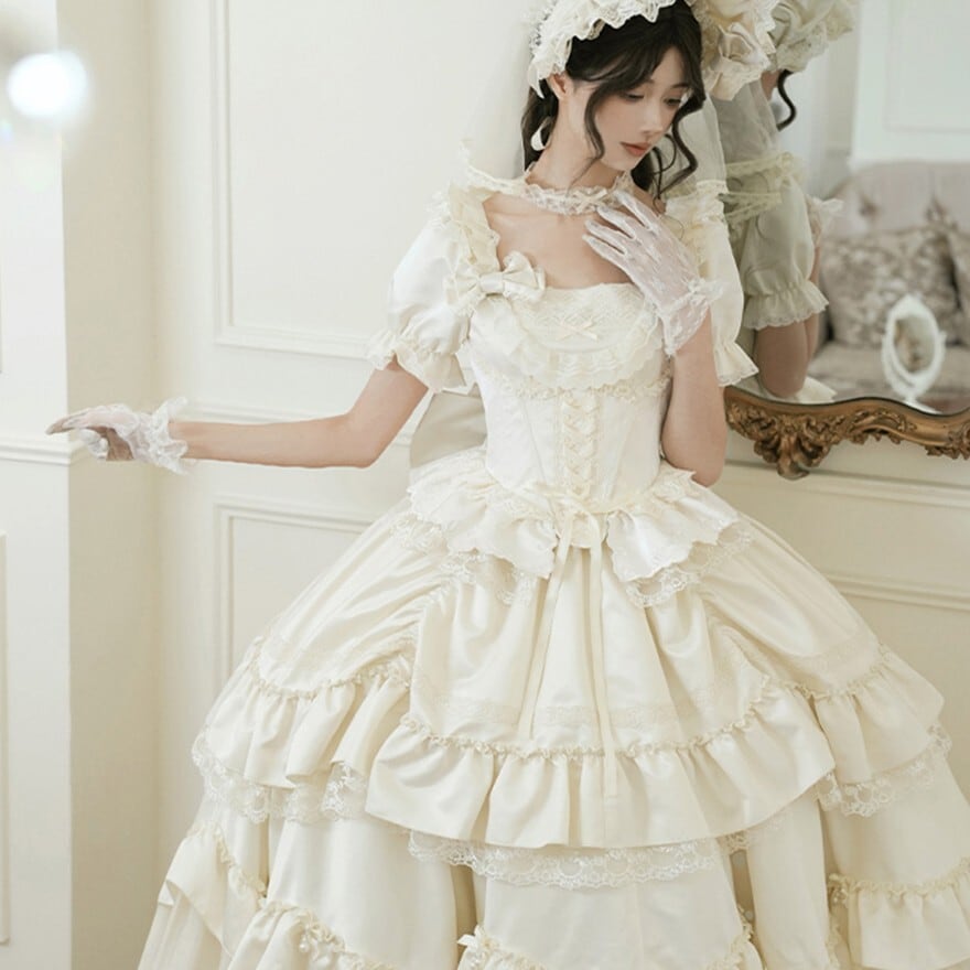 ふんわりと広がるティアードスカート、繊細なレースの数々、そして上品な光沢感が、あなたの魅力を最大限に引き出します。