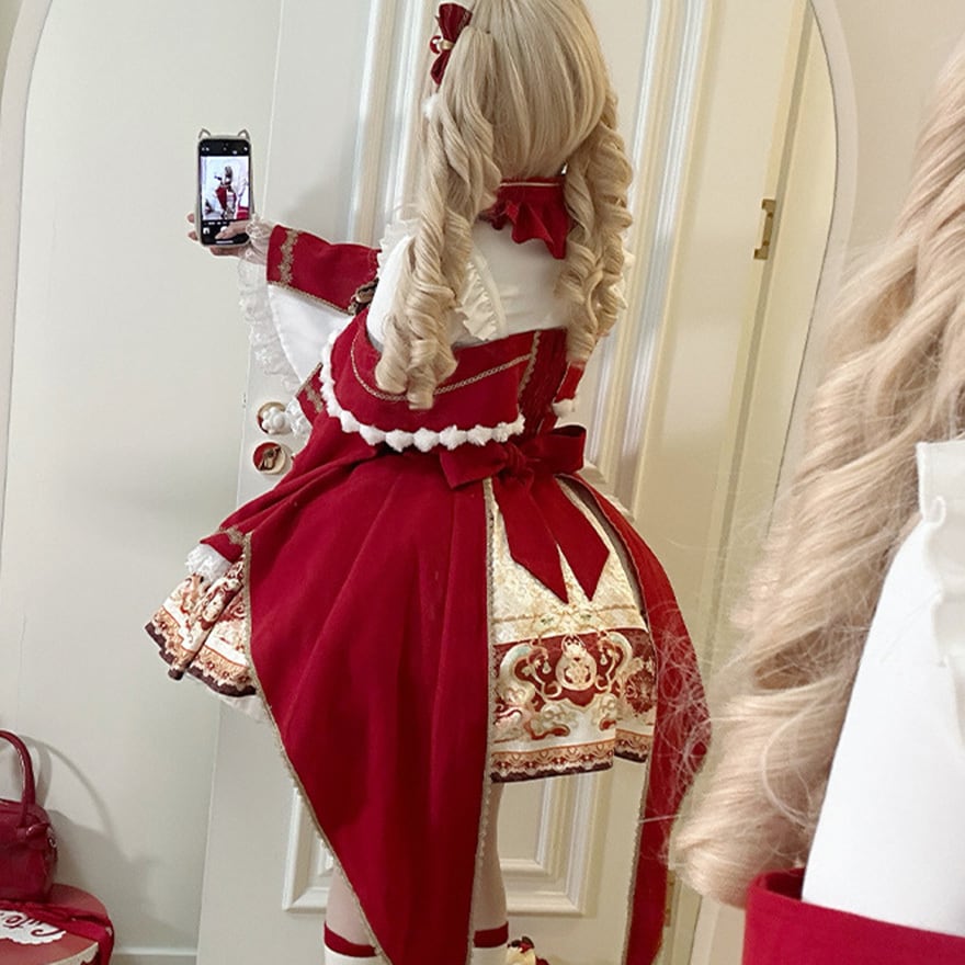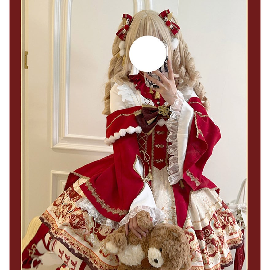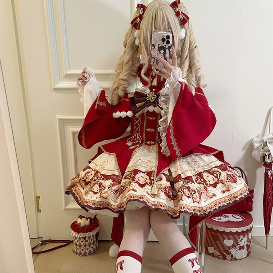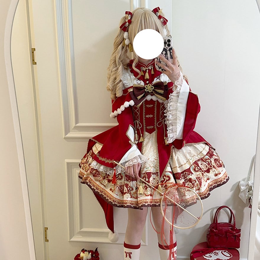 深みのあるレッドを基調に、クリーム色の生地とオリエンタルな柄が組み合わされた、華やかなロリィタドレスのセットアップです。