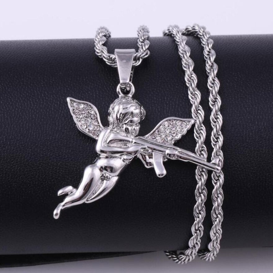 愛の象徴である天使(キューピッド)が、物騒なマシンガンを構えるという、皮肉とユーモアにあふれたモチーフのネックレスです。