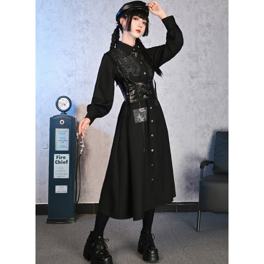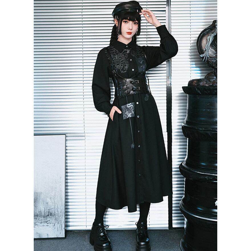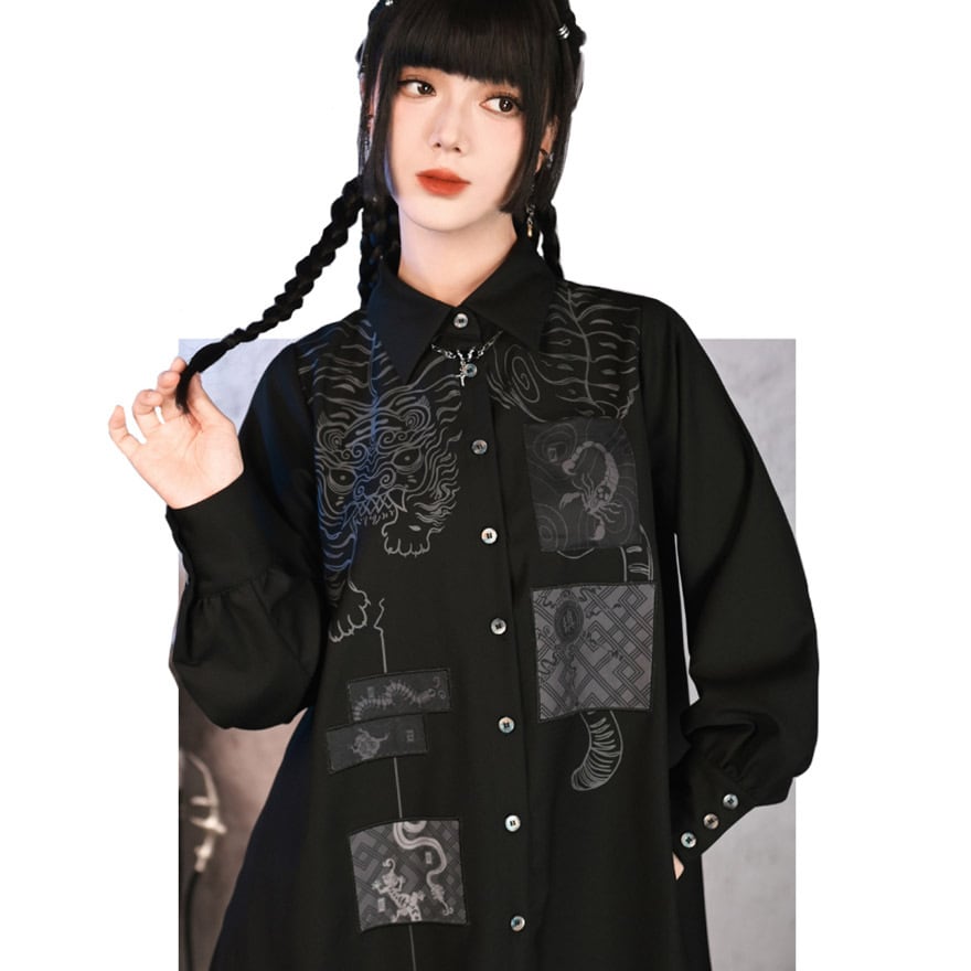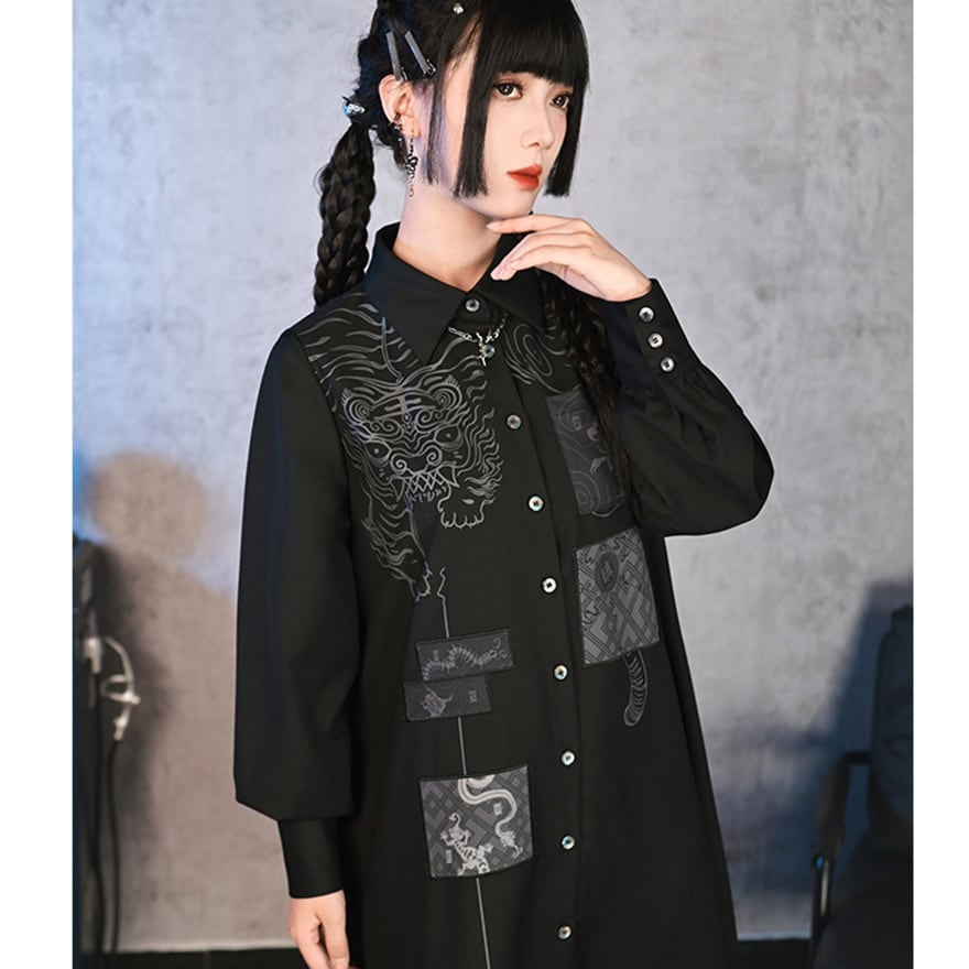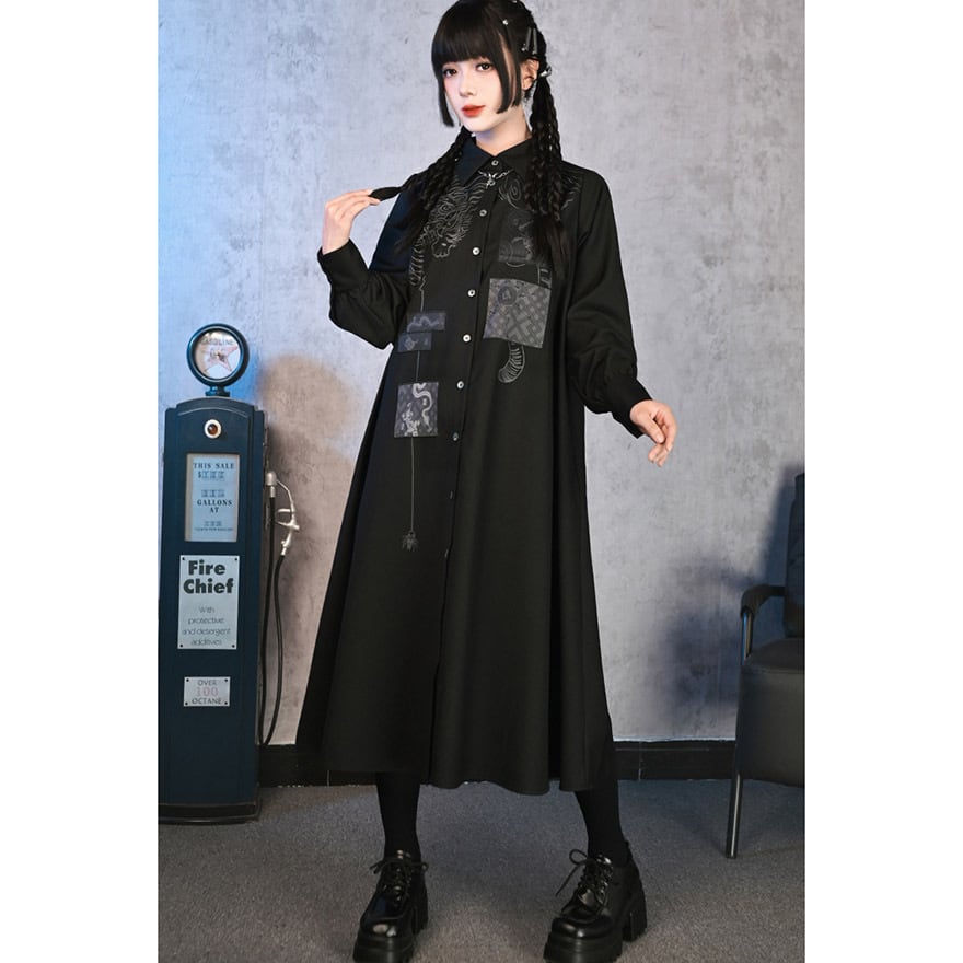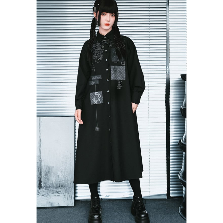 関連キーワード: #サブカル #地雷系 #シャツワンピース #中華風 #ゴシック #刺繍 #龍 #パッチワーク #黒 #ロングワンピース #モード系