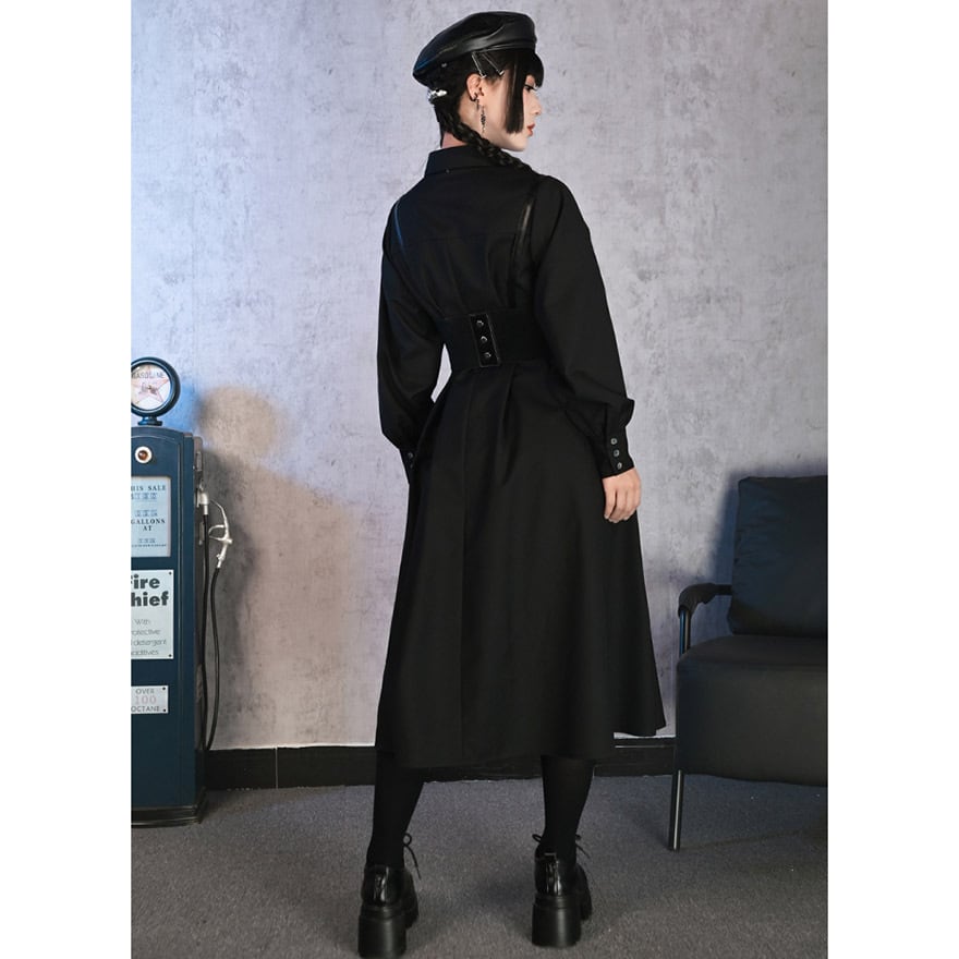 シックなブラックを基調とした、モードな雰囲気漂うロング丈のシャツワンピースです。