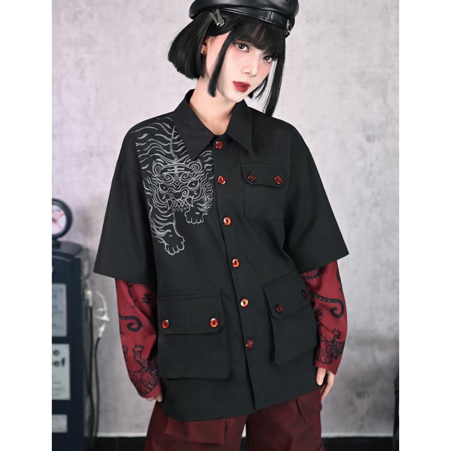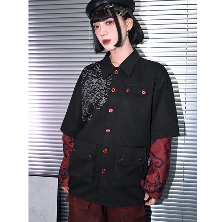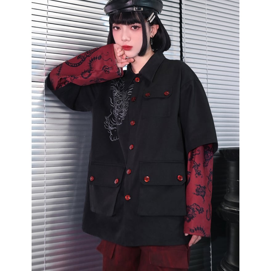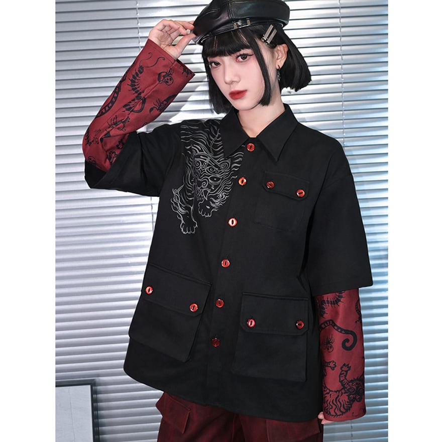 関連キーワード: #サブカル #地雷系 #ジャケット #ストリートファッション #中華風 #虎 #ミリタリー #フェイクレイヤード #重ね着風 #黒 #赤