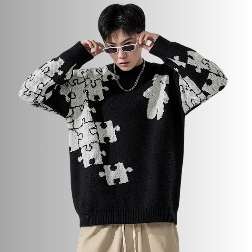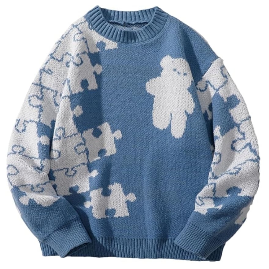 ざっくり手編み風のくまちゃんジグソーのメンズニットです