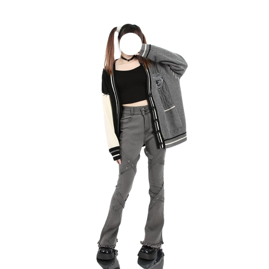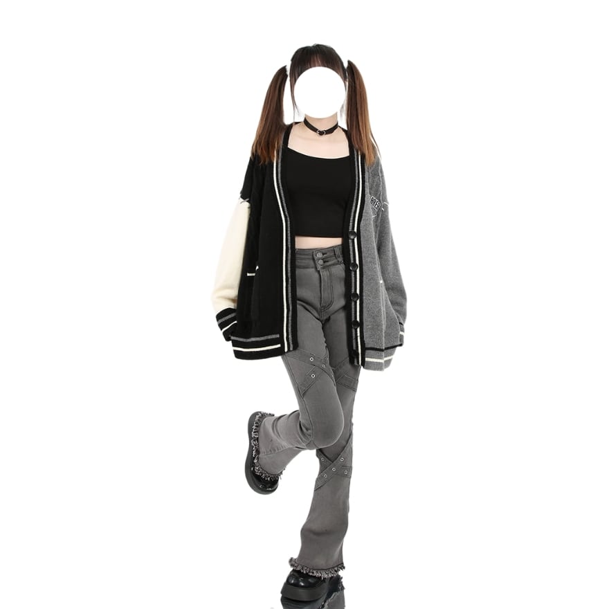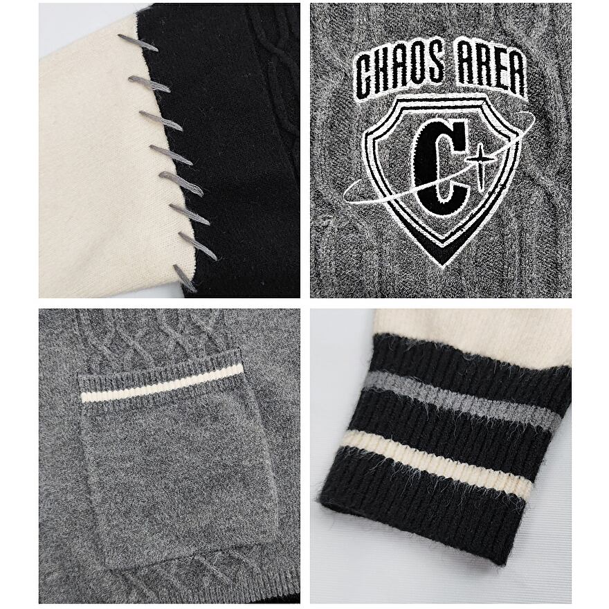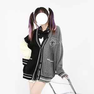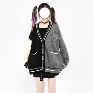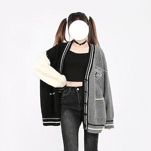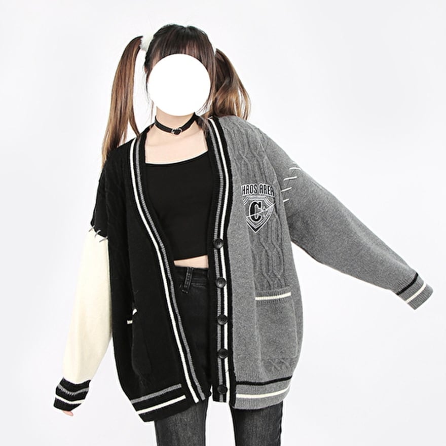 スタジャンとカーディガンがドッキングしたような個性的デザインのカーディガン