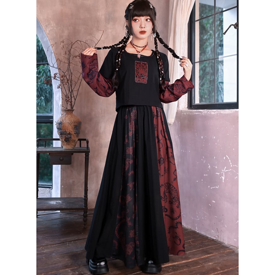 関連キーワード: #サブカル #地雷系 #ゴシック #中華風 #チャイナ #プリーツスカート #ロングスカート #アシンメトリー #虎 #五毒 #個性的 #秋冬コーデ #アラサーコーデ