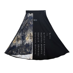 流麗な書がプリントされた漆黒の生地と、古びた金属や壁画を思わせるアーティスティックな生地を大胆に切り替えた、アシンメトリーデザインのロングスカートです。