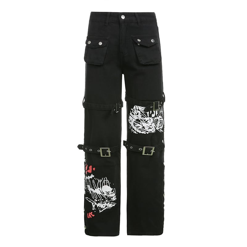 バックルベルトにプリントされた病み可愛いゴシックなデザイン、パンツ裾はスナップボタンだから