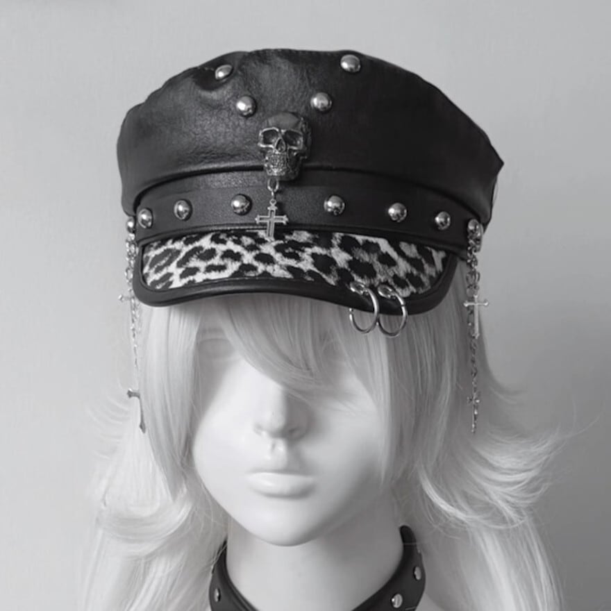 ダークゴシックなスカルがインパクト抜群なスタッズ付きフェイクレザーキャップです