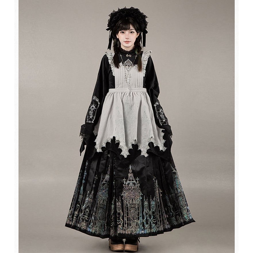ワイドな袖が特徴的な漢服の「大袖衫」と伝統的な「馬面裙」に、西洋のゴシック要素を融合させた、唯一無二の5点セットです。