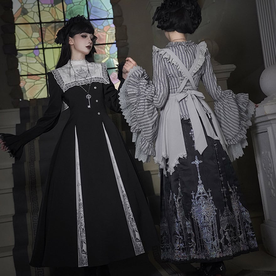 ゴスロリ 5点 セット 漢洋折衷 ロングスカート 大袖ブラウス ヘッドドレス 黒白 ロリィタ PUJI