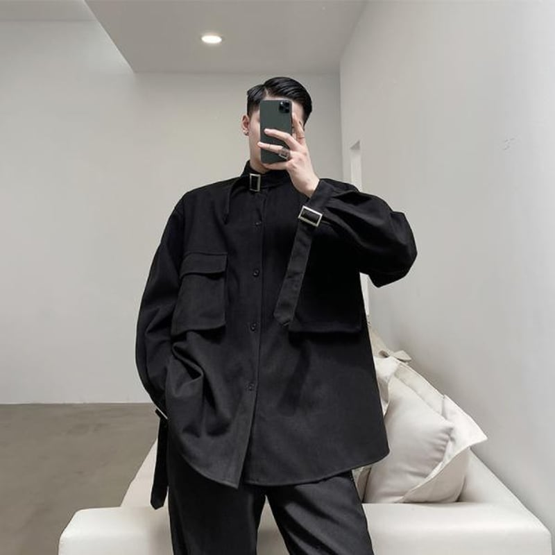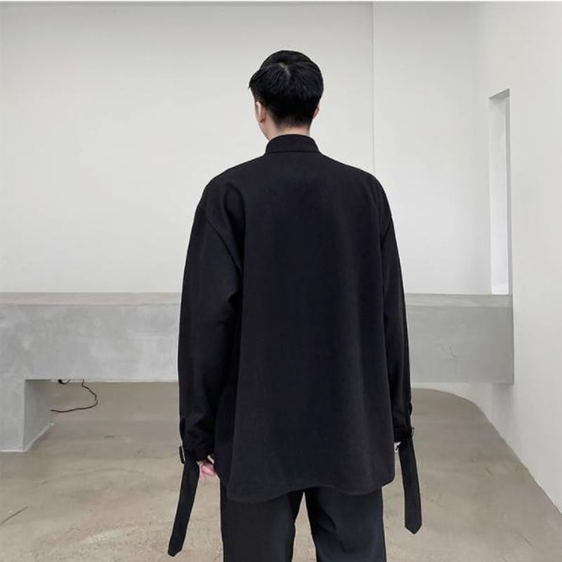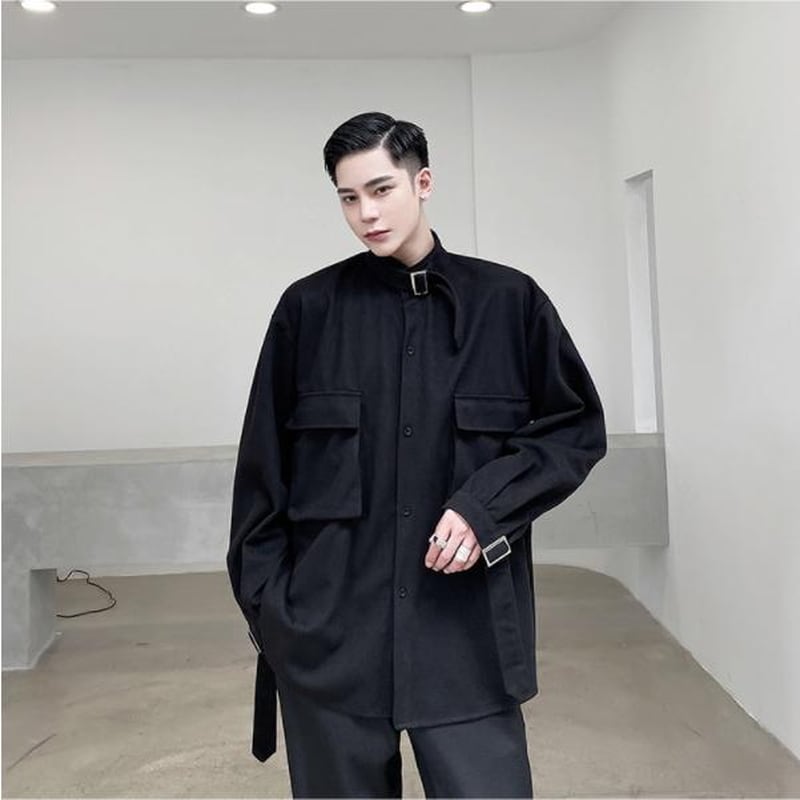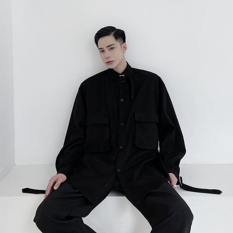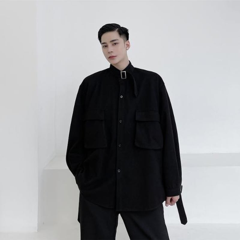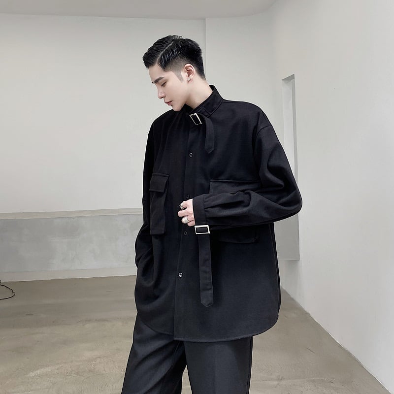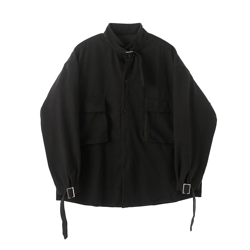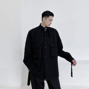 厚手生地のジャケット、黒シャツです。黒シャツとしてはもちろん、Tシャツから羽織っておとなかっこいいジャケットとして着用頂けます。ネックベルトと袖ベルトがモダンなデザインのトップスです。