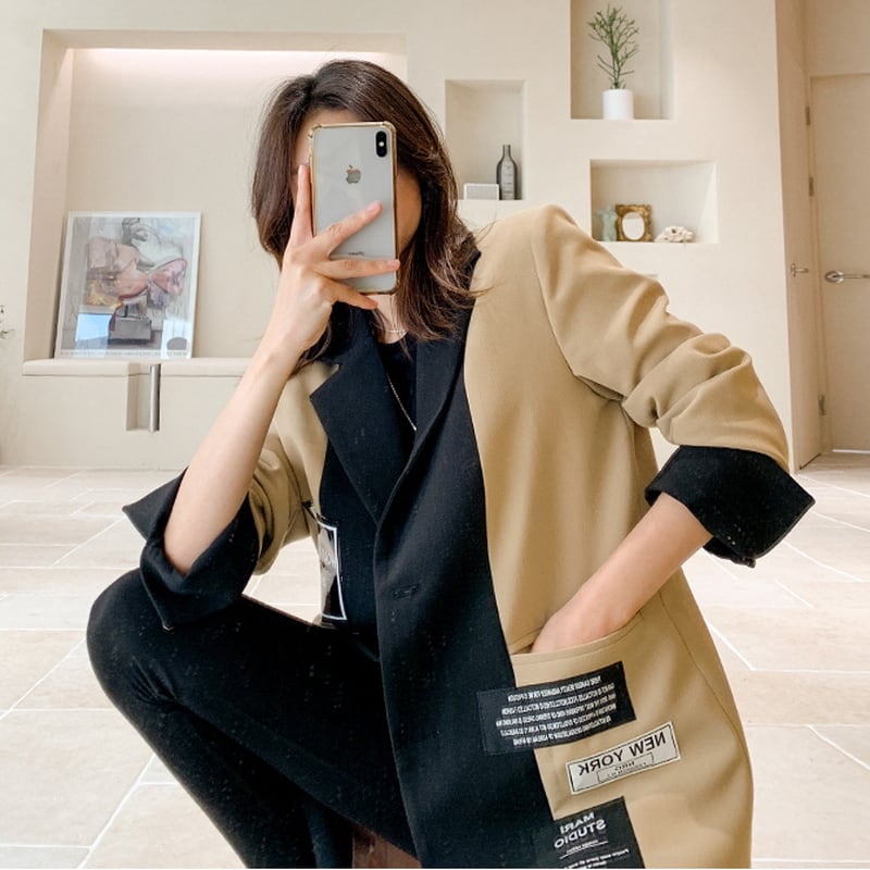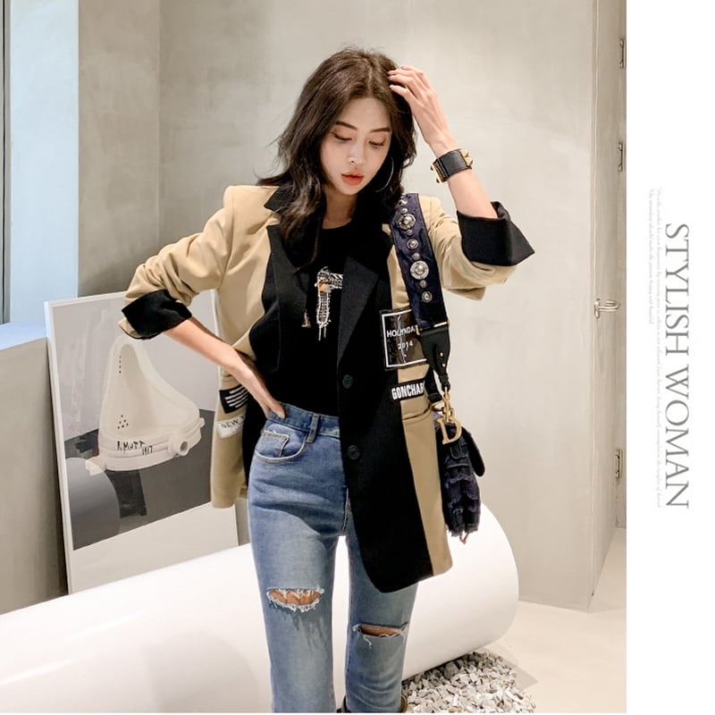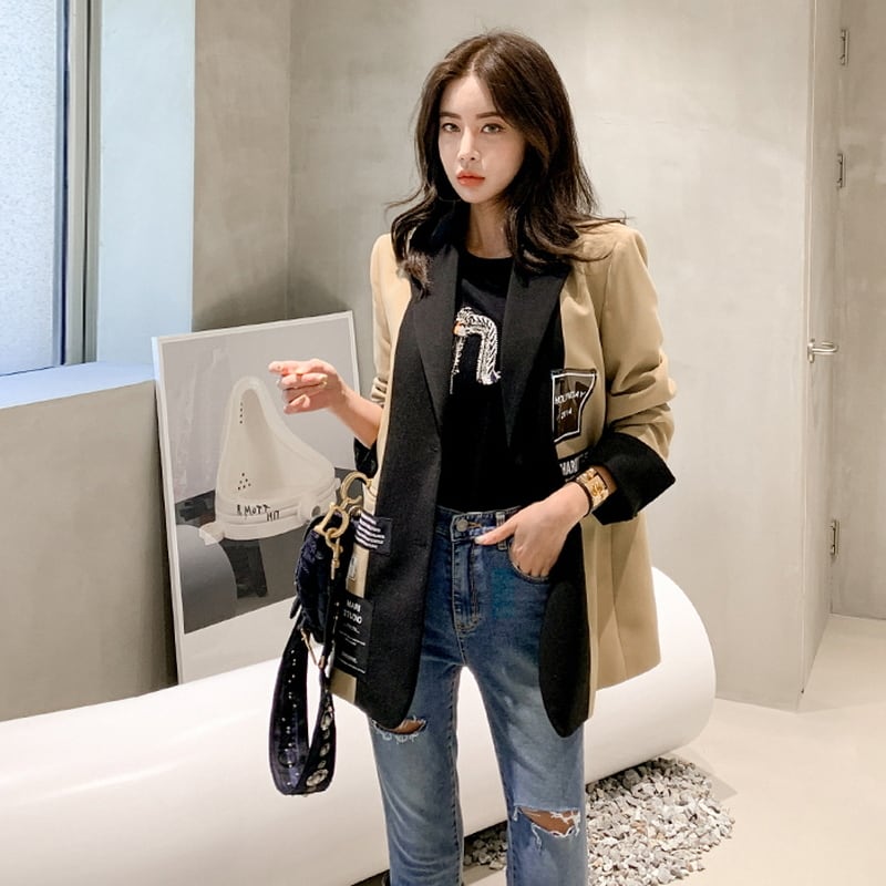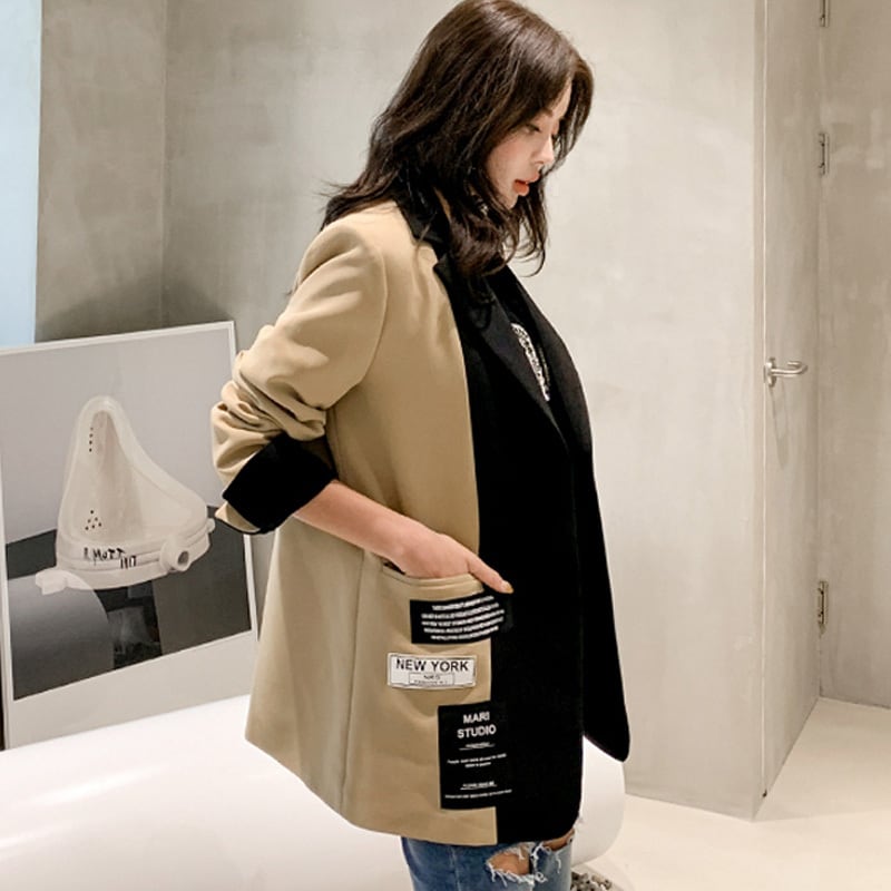 シングルブレストに大胆なバイカラーの色使い、エッジの効いた英字ロゴが個性的なジャケットです。さらっと羽織るだけでストリート系コーデを格上げしてくれます。