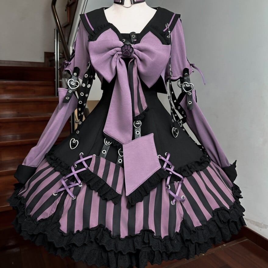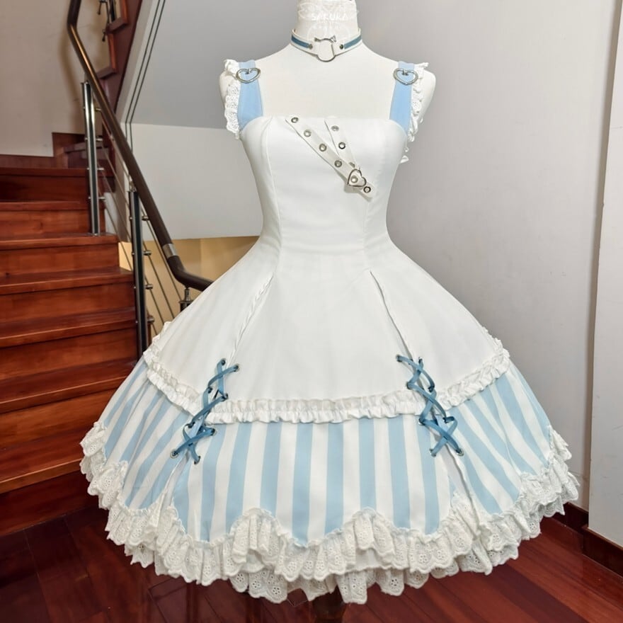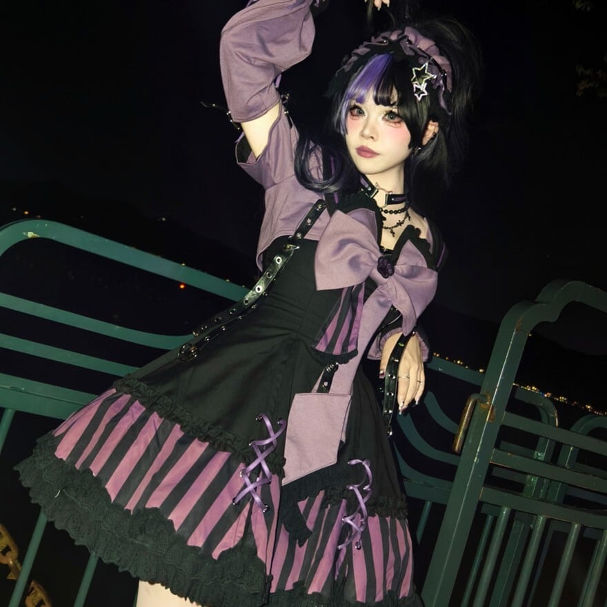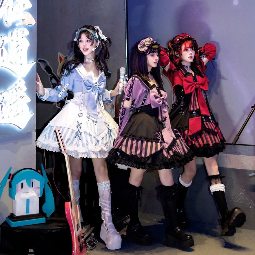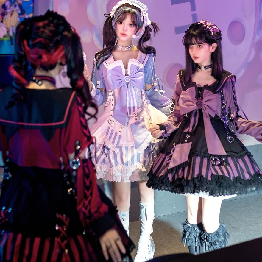 淡い水色と白、あるいは赤と黒、またはラベンダーと黒のポップなストライプ柄が目を引く、JSKワンピース、上着、大きなリボンの3点セットです。