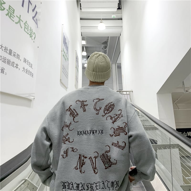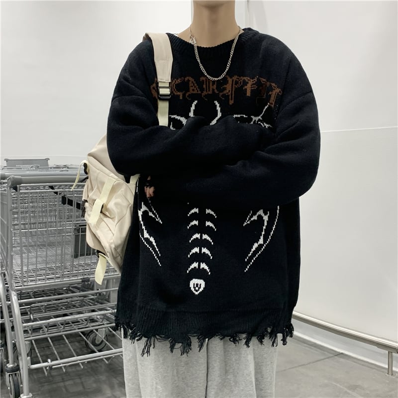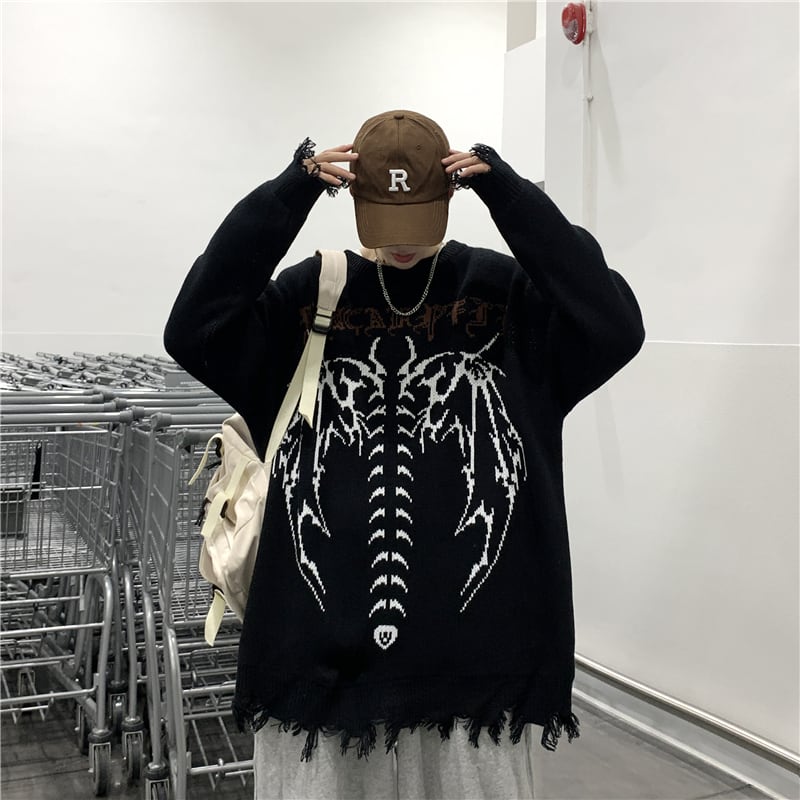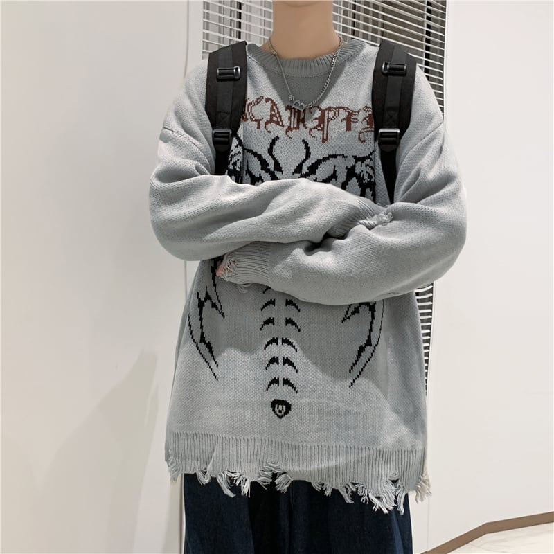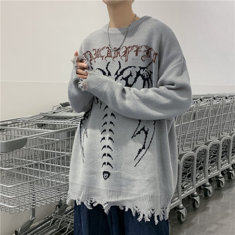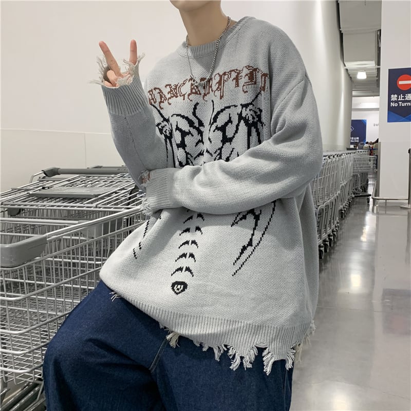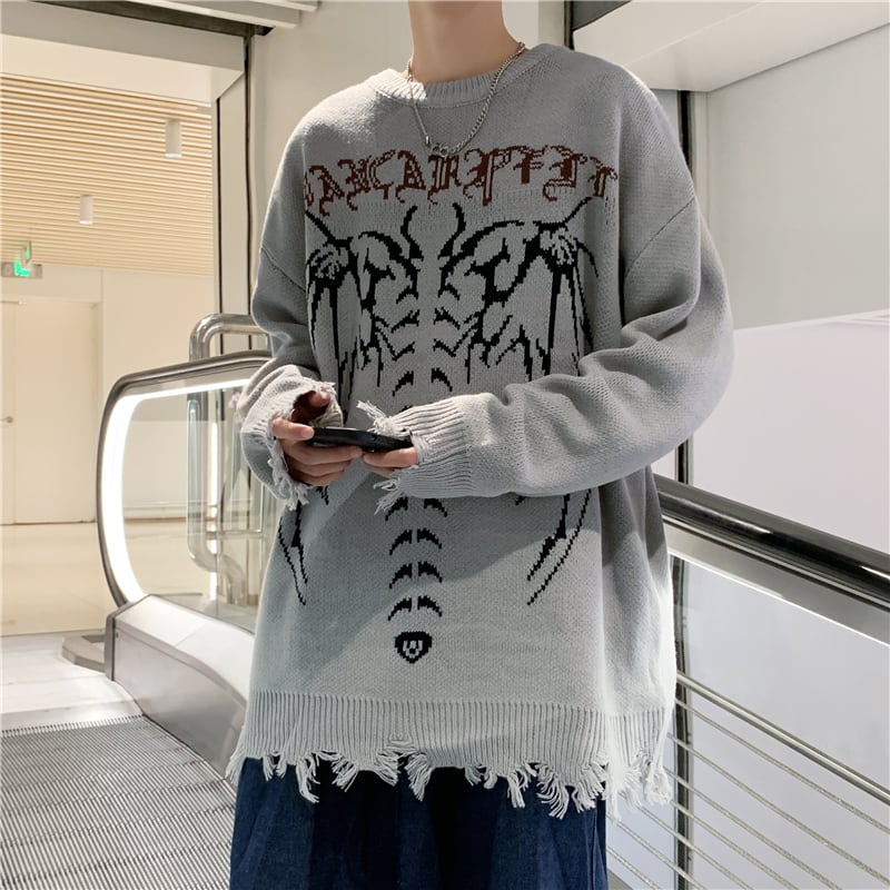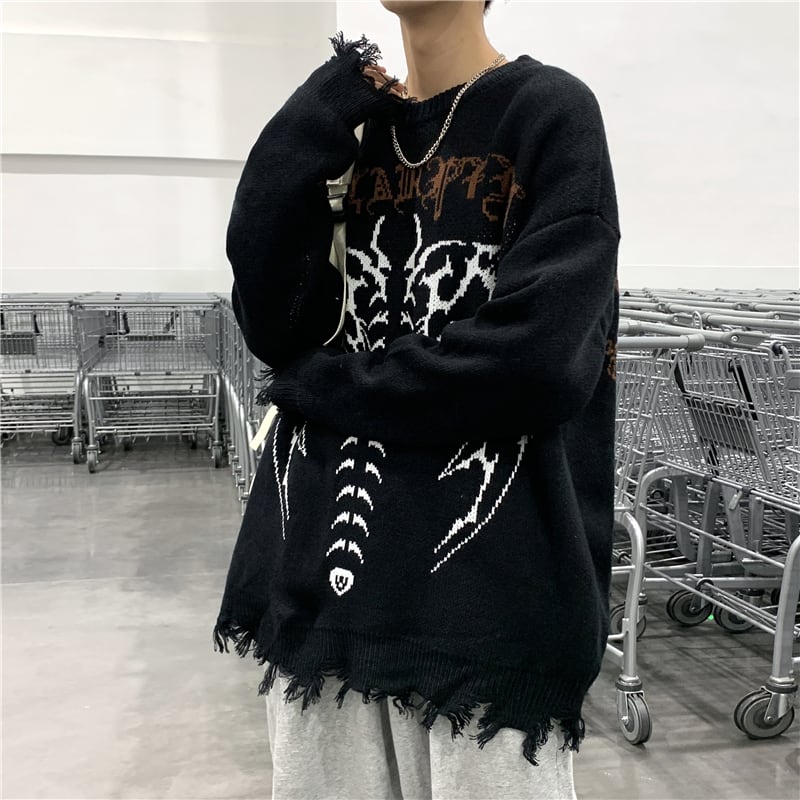 【即納】メンズゴシック ニット ダメージ加工 ゴシック バックロゴ ストリートファッション