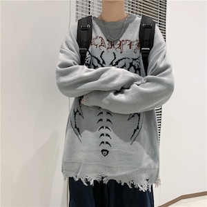 スカルデザインの病みカワクラッシュダメージ加工のメンズニットです