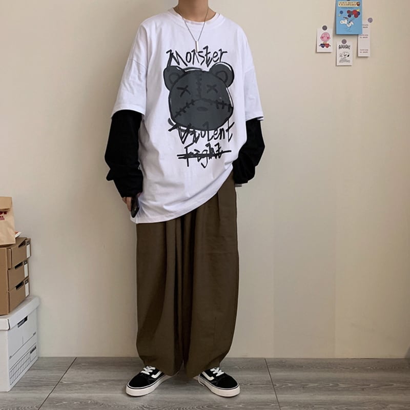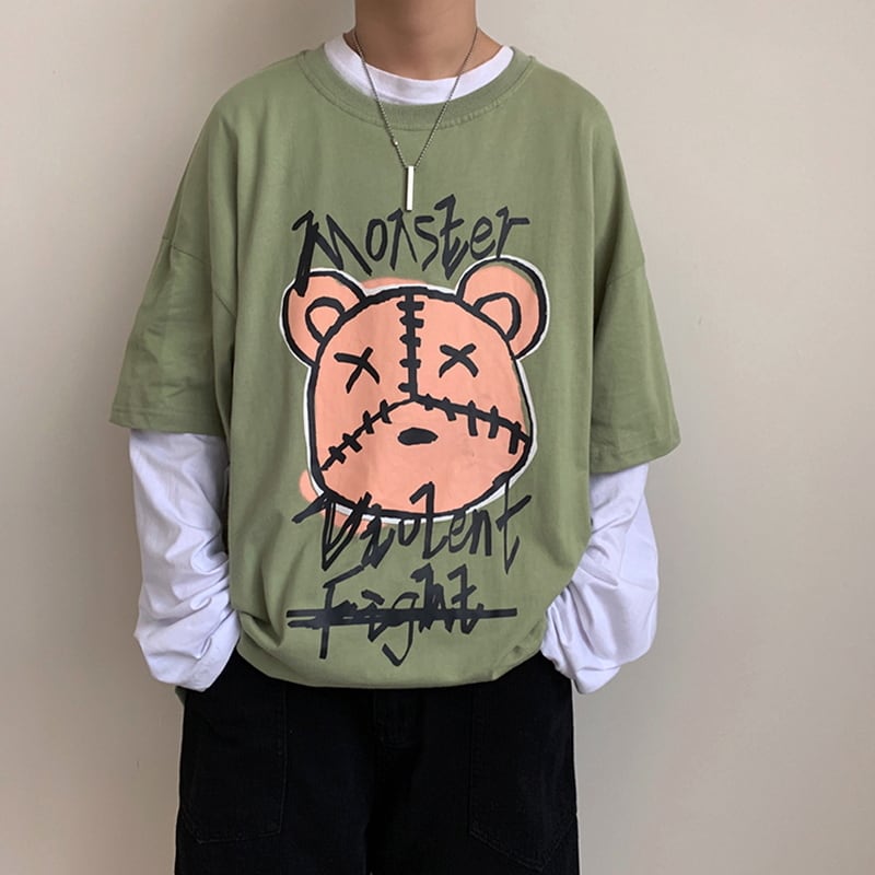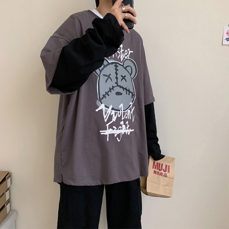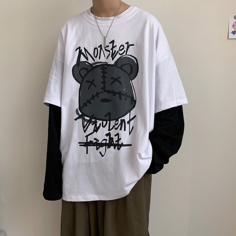 サブカル系 フェイクツーピース 長袖Tシャツ くまちゃん イラスト風プリント