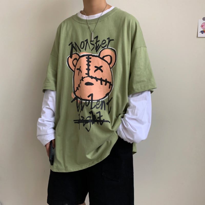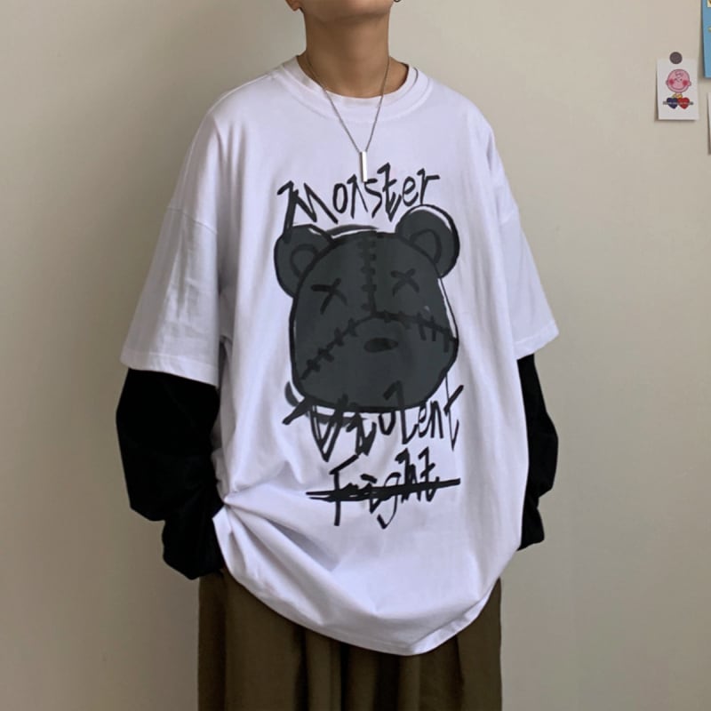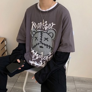 病みかわいいクマちゃんプリントのフェイクツーピースTシャツです。