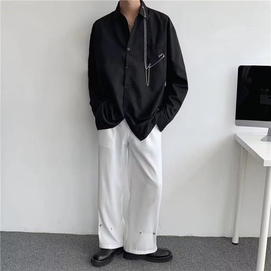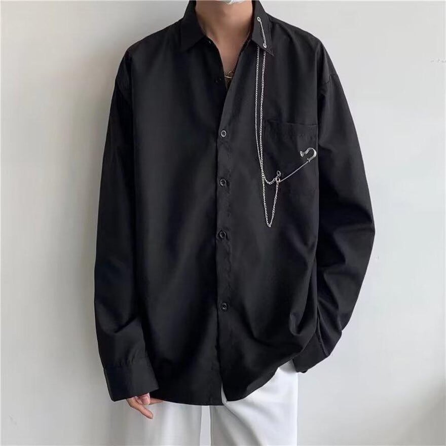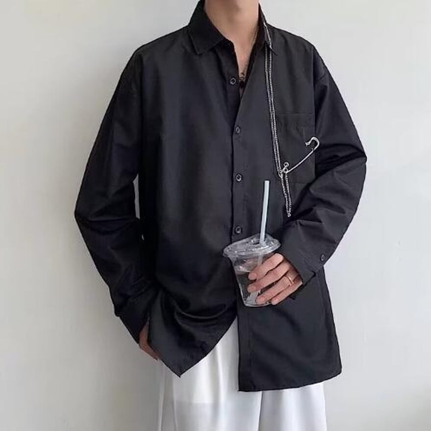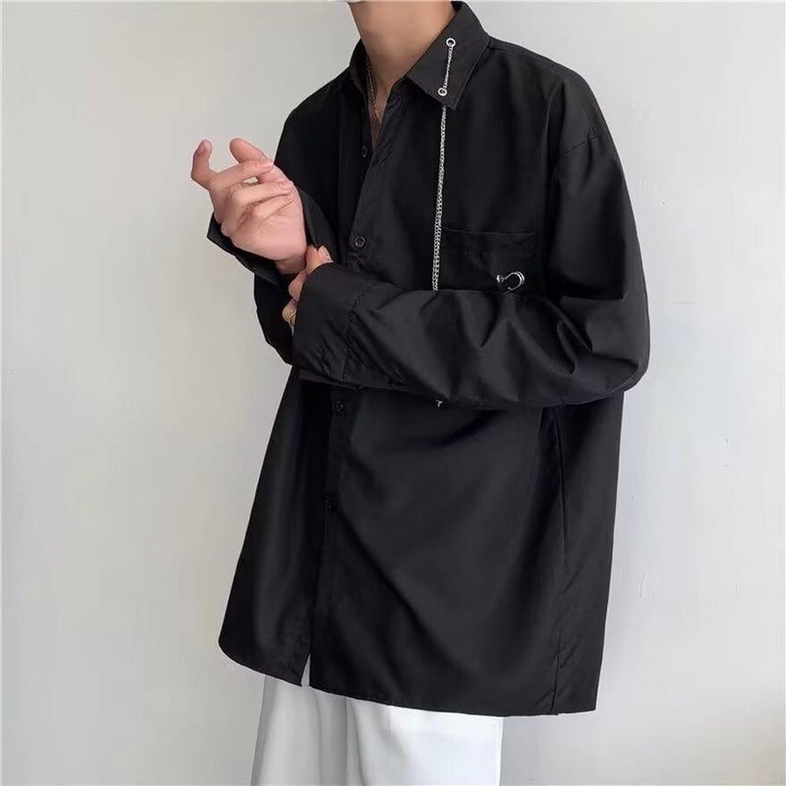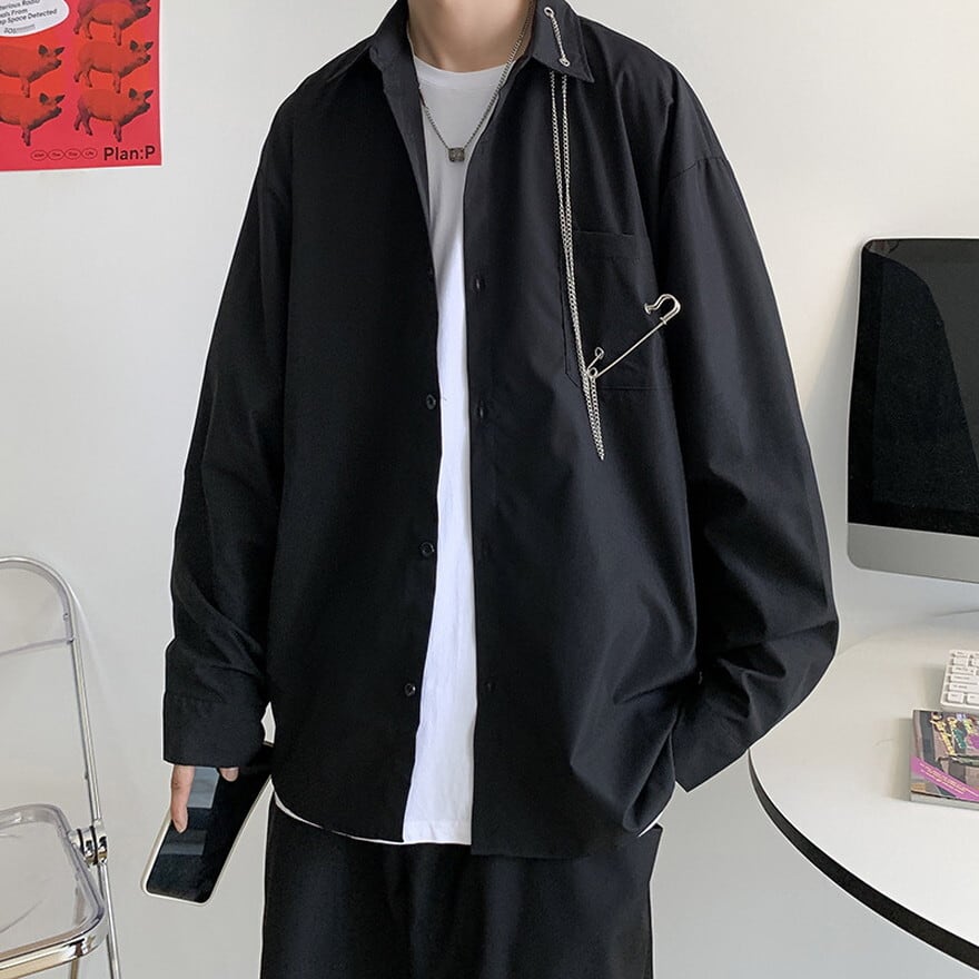 定番のメンズシャツを、サブカルファッションの要素で大胆にアップデートした長袖シャツです。ドロップショルダーのオーバーサイズシルエットに、Dカンやリング、取り外し可能なチェーンアクセサリーをプラス