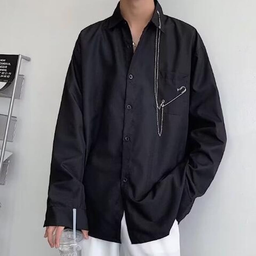 【現品Lサイズ】 サブカル男子/ジェンダーレス チェーン&リング付 ロング丈シャツ | V系 ストリート モード